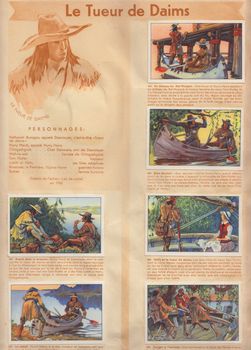 remarques: | adaptation d'oeuvres de James Fenimore Cooper (1789-1851) sous la forme d'un album d'images constitué de 300 vignettes collées sur 50 pages à raison de 6 vignettes par page, l'album est en ABE pour l'aspect extérieur mais en BE pour l'intérieur et surtout l'album est bien complet de ses 300 vignettes archives: >> voir sous Cooper l'album comprend une introduction sur les peaux-rouges et 5 épisodes de la saga de Bas-de-Cuir (Leatherstocking) = Nathaniel Bumppo, le trappeur, figure marquante dérivée du Daniel Boone historique, soit: 1) les pionniers (the pioneers) 1823 intitulé dans l'album le tueur de daims (deerslayer) avec son compagnon l'indien Chingachgook, chef Delaware, appelé aussi grand serpent, l'action se déroule près du lac de Cristal vers 1740 et met en prise des combats contre Rivenoak, chef des indiens hurons 2) le dernier des mohicans (the last of the Mohicans), 1826 le plus célèbre épisode de la saga qui met au prise le tueur de daims appelé maintenant Oeil-de-Faucon, Chingachgook, Uncas le fils de Chingachgook = le dernier des mohicans ainsi que les filles du commandant de Fort Henry: Alice et Cora contre Magua, le chef félon des hurons, l'action se passe dans les environs de Fort William Henry au nord-est du lac Ontario vers 1757 3) le lac Ontario (the pathfinder) 1840 en fait, part IV de la saga intitulé dans l'album "le chercheur de pistes", le tueur de daims s'appelle maintenant l'Eclaireur et l'action consiste en diverses aventures vers 1760 sur le lac Ontario entre fort Oswego (anglais) et fort "Mille Iles" (français) 4) le tueur de daims (Deerslayer) 1841 en fait part V de la saga, intitulé dans l'album "les colons du lac Otsego", aventures et intrigues près du lac Otsego, hiver 1793/1794, mort de Chingachgook 5) la prairie (the prairie) 1821 en fait part III de la saga, intitulé dans l'album "le vieux trappeur", aventures dans la grande prairie (Louisiane 1804) entre Nathaniel Bumppo devenu le vieux trappeur, un groupe d'émigrants et Mahtore, chef des indiens sioux et Coeur-Dur, chef des indiens pawnee, apparition du lieutenant Uncas Middleton, petit-fils du major Duncan-Heyward qui a pris le nom de Uncas en hommage au dernier des mohicans, on y trouve aussi Paul Hover, un chasseur d'abeilles >> un album mythique, très difficile à trouver complet de ses vignettes, des aventures pas toujours conformes à celles de Fenimore Cooper, au style un peu naïf et enfantin mais charmant avec une information plutôt intéressante sur les peaux-rouges dans l'introduction de l'album |