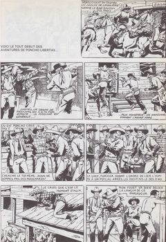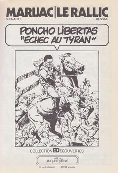 remarques: | les premières aventures de Poncho Libertas qui se bat en hors-la-loi pour la liberté à El Paso avec ses amis Broncho Bill (frère de la belle Junanita Alvarez), Balle sure et Eperon d'argent contre la tyrannie du gouverneur félon Gonçalez et ses acolytes: l'indien Plume de Corbeau et le bandit José Satanas qui porte la marque des lâches (défiguré) après mouts combats et intrigues, Gonçalez sera renversé grâce à l'appui du colonel Ramirez, chef des troupes gouvernementales et fiancé de Juanita mais les deux plus mauvais: Plume de Corbeau et Satanas réussiront à s'enfuir >> p. 17 le champ de cactus qui entourent El Paso >> un bon graphisme de Le Rallic (surtout pour les chevaux), scenario assez intéressant, mais texte encore rudimentaire |