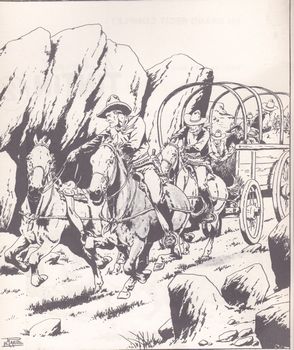 remarques: | épisodes parus dans le Journal de Tintin en 1947, resp. 1950 1) Teddy Bill, défenseur des frontières, 1ère partie (1947) les aventures de Teddy Bill, garde-frontière à Jerrytown près de Denver, lutte contre la bande d'outlaw de Jeewes qui soulèvent les indiens contre les colons blancs, lutte des jaquettes bleues contre les indiens, Noamic le sioux devient l'allié de Teddy Bill qui fait la connaissance de la jolie Olivia, finalement la paix sera conclue avec les sioux >> p. 3 et 29 où une bonne dose d'alcool fait beaucoup de bien 2) le poignard d'or (1950) première partie cet épisode a fait l'objet d'un album, commentaires >> voir l'album Yan Keradec par Gordinne >> le graphisme est cette fois déjà typique pour Le Rallic (les chevaux, les indiens, les outlaws, les armes) et la réédition du graphisme est assez bien faite quoique n'égalant pas celle du Journal de Tintin, le scenario n'est pas très recherché, mais reste intéressant (avec beaucoup de chefs dans cet épisode) à noter: une jolie couverture d'album |