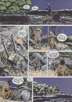 remarques: | guerre de Sécession, le jeune Drustan refuse de servir dans l'armée de la Confédération et s'enfuit avec l'esclave noir Matt après avoir traversé le Mississipi, ils tombent sur un parti nordiste, Drustan est fait prisonnier et Matt est enrôlé dans l'armée nordiste dans le camp de prisonniers, Drustan fait connaissance avec Hermès, le docteur-comédien qui le fait évader et l'enrôle dans sa troupe théâtrale: le chariot de Thespis (= acteur grec de tragédie dans l'Antiquité) >> p. 17 le monde est un grand théâtre dont le ciel en est la toile les deux compères arrivent dans une petite ville du Sud qui est assiégée par la bande de Muerte Kid, il n'y a plus que des femmes pour défendre le village, mais un ancien éclaireur Joe Adam se joint à eux et tous ensemble, les assiégés réussiront à blesser le chef de la bande, Muerte Kid et le village sera sauvé Joe Adam rejoint la troupe de Thespis et tous les trois continuent leur voyage vers l'Ouest >> p. 22 le sosie de Mac Clure (>> voir Blueberry) >> un nouveau genre de western: le western poétique et théâtral, un scénario assez intéressant pour ce premier album avec un graphisme également bien réussi |