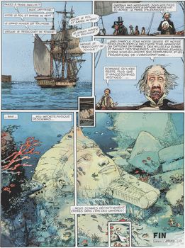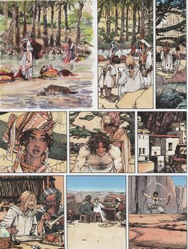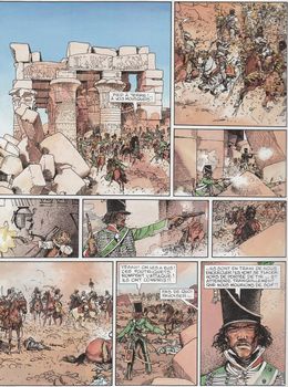 remarques: | volume 9 le papyrus de Kôm-Ombo, l'ambition "tu ne convoiteras pas le bien d'autrui", dessinateur: Faure (très bon graphisme de Faure qui restitue le mieux l'atmosphère de cet album) pages de garde: arbre généalogique des détenteurs de Nahik Le Caire 1798, armée de Bonaparte, Eugène Nadal, capitaine de cavalerie et Denouettes, scientifiste et artiste, partent à la recherche des ruines de Kôm-Ombo et tombent sur un sanctuaire dissimulé par des falaises qui est une oasis de végétation, où s'abrite une secte dissidente de l'Islam actuel et où l'on découvrira l'omoplate et les manuscrits de Mohamet où Denouettes fera ses fameuses aquarelles l'omoplate sera perdue mais elle subsistera parmi les dessins de Denouettes le récit détaillé: Le Caire 1798, Eugène Nadal, capitaine dans l'armée de Bonaparte, est chargé d'escorter l'achéologue et peintre Fernand Desnouettes à la recherche d'un temple mystérieux d'une secte musulmane hérétique dans les ruines ptolémaïques de Kôm-Ombo >> p. 8 ya rabbi = juron arabe, ar rahim = le miséricordieux >> p. 9 le temple de Karnak >> p. 11 l'attaque des mameluks après être pourchassés par les mameluks, Nadal et Desnouettes réussissent à se réfugier par hasard dans le labyrinthe de Thôt qui protège l'accès au sanctuaire des vrais croyants, une oasis luxuriante et isolée au coeur du désert égyptien >> p. 23 le sanctuaire de Kôm-Ombo ils sont soignés par Nabila et sa fille Smirna, descendantes de Mahdjubah, qui dirigent la communauté, ils y découvrent la fameuse omoplate de dromadaire surlaquelle sont inscrits les dernières volontés du prophéte y compris un manuscrit = le testament du prophète Nabila tombe amoureuse de Nadal qui lui veut quitter à tout prix le sanctuaire en emportant l'omoplate, le manuscrit et de nombreuses aquarelles faites durant le séjour de Desnouettes dans l'oasis avec le manuscrit, Nadal veut semer la pagaille chez les arabes pour favoriser la conquête de l'Egypte par la France mais Denouettes s'y oppose Fâhr'and = Fernand comme l'appelle Nabila une lutte s'engage entre les deux hommes et Denouettes est tué par Nadal qui s'enfuit en emportant Smirna comme otage et comme guide, celle-ci est libérée après coup, mais Nabila rejoint Nadal au Caire pour se venger en le tuant, elle constatera toutefois que son amour pour Nadel est le plus fort et au fond d'elle-même elle veut aussi faire connaître à l'Islam les dernières volontés du prophète malheureusement, lors d'une émeute au Caire, Nabila est tuée et Nadal, gravement blessé au visage et à la tête, perd la raison; il est rapatrié en France avec le manuscrit et les aquarelles mais l'omoplate est jetée à la mer durant la traversée >> un très bon album bien élaboré par Giroud et bien dessiné par Faure avec également une jolie couverture d'album |