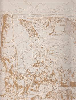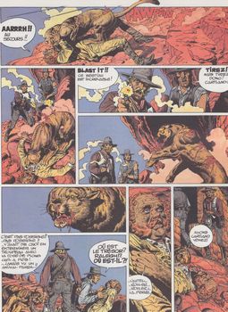 remarques: | San Francisco, 1860, Cartland devient guide pour une expédition archéologique recherchant un tombeau pueblo devant contenir le trésor de la femme-araignée (la femme-araignée chez les indiens hopi est la déesse responsable avec ses fils de l'ordre et du désordre, du bien et du mal et le puma immortel en est le gardien) l'expédition est constitué du politicien Bolton, du savant Raleigh et de sa fille Cynthia-Ann, une petite peste >> p. 4 les subtilités du parler chinois (Monsieur Bolton au lieu de Borton) s'en suit une suite d'évènements dont l'enlèvement de Cynthia-Ann par un chef navajo, la découverte du trésor qui n'est qu'un fétiche, Raleigh meurt tué par le puma immortel, Bolton est exécuté par un chaman, Cartland réussira à délivrer Cynthia-Ann qui à son retour devient entraîneuse dans un saloon et dépendante du mescal dont les navajos l'avaient drogué alors que Cartland marche sur le chemin de sa destruction >> un scenario plutôt compliqué genre énigme policière mais le graphisme reste toujours aussi superbe n.b. à noter le répertoire des jurons de Cartland: jumpin jehosaphat, blast it, blazes, hell's bells, etc |