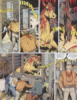 remarques: | dernier album de la série au début de l'album, résumé de 3 pages sur l'album tome 8 "les survivants de l'ombre" où la mission de Cartland avait commencé avec le sauvetage du cheval "lune d'automne" ou "full moon" Cartland arrive le 30.6.1863 à San Juan Bantista où il rencontre le padre Gabriel et la veuve Violante Moralès qui ne veut pas reconnaître la mort de son mari car elle se sent menacée, un soi-disant ennemi opérant des tours de magie noire dans l'hacienda >> p. 30/31 une chasse à l'ours et à l'homme où l'odeur de charogne est partout finalement, Cartland réussira à résoudre le mystère: c'est Guillen, l'ancien amant de Violante, frappé de folie qui est l'auteur des méfaits, s'en suit une dernière chasse à l'homme où Guillen trouvera la mort dans les bras de Violante "vaya con dios senor Cartland" qui recevra comme récompense le cheval "full moon" ou "pleine lune" ou "lune d'automne" alors que "lune de folie" serait plus approprié pour ce cheval qui est peut'être la vraie vedette de ce récit >> un album de peu d'éclat et d'un gout douteux avec l'odeur de charogne qui se répand dans le récit, les répères du diables sont peu répérables dans ce scenario macabre à la "Romeo et Juliette" et le graphisme est en nette dégression n.b. mention des "fleurs du mal" par Baudelaire, livre mis à l'index, critique de Dieu et de l'Eglise >> le dernier album de la série et le moins bon tant pour le scenario que pour le graphisme, un texte pas très riche et peu compréhensible, Harlé n'a plus grand chose à raconter, quelle différence avec les premiers albums de la série |