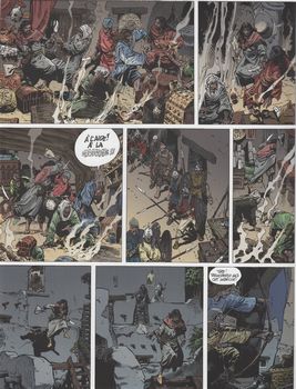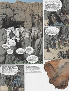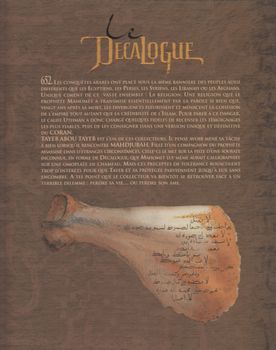 remarques: | volume 10 la dernière sourate, religion et raison d'état "tu feras aimer Dieu par l'exemple et non par la force", dessinateur: FRANZ cette fois, on arrive au commençement et au coeur du problème avec la fameuse omoplate sur laquelle serait écrit les derniers commandements du prophète Mahomet, en quelque contradiction avec les directives du successeur de Mahomet qui avec ses recenseurs (dont Yateb) recherchent tout ce qui pourrait contribuer à assimiler dans un livre unique (le Coran) les commandements que Mahomet a pu laisser oralement et cette omoplate si vraiment écrite par Mahomet serait la dernière sourate = la dernière volonté du prophète Egypte 632, oasis de Wadt-Beyh, une communauté persécutée et dirigée par une femme Mhadjubah, est visitée par le collecteur Tayeb chargé de la recension du Coran = revision du Coran, c'est à dire éliminer les versets douteux, trancher entre les versets contradictoires et les consigner dans un livre unique: le Nahik (genre de Bible) car Mahomet a transmis sa religion par la parole et il n'y que peu de traces manuscrites, ce qui donne naissance à des divergences d'interprétation du Coran Uthman, successeur de Mahomet, a chargé l es collecteurs ou recenseurs (dont Tayeb) d'interroger à ce sujet les derniers compagnons de Mahomet; à Wadt-Beyh, Tayeb recherche un groupe de croyants qui détiendraient un décalogue de Mahomet (commandement) >> p. 12/13 quelques belles planches de Franz Mahdjubah cite alors oralement les 10 commandements du prophète mais selon Tayeb le premier, le cinquième et le dixième (tu ne tueras point, tu pardonneras à tes ennemis, tu feras aimer dieu par l'exemple et non par la force) contredisent les actes du prophète et la politique de ses successeurs Tayeb doute de ses commandements mais Mahdjubah prétend qu'il existe un texte écrit du prophète mais ce texte a disparu lors du pillage de la communauté par des brigands le deuxième commandement (tu restera à l'écoute de ta conscience pour y entendre la voix de Dieu) prête aussi à confusion selon Tayeb car si chacun peut méditer à sa façon où est l'unité de la nation musulmane? Mahdjubah se souvient que deux serviteurs pourraient être en possession du texte, ils sont actuellement à Medina, ville du prophète, Hafsa la servante leur conte l'histoire de l'omoplate de dromadaire découverte par Khalid, le père de Mahdjubah à la mort du prophète sur laquelle serait écrit les 10 commandements de Mahomet, si cela était authentique, ce serait la dernière sourate = la dernière volonté du prophète >> p. 18 les femmes du prophète et l'omoplate du dromadaire mais le calife de Medina juge que ce manuscrit ne doit pas être diffusé car il n'est pas en accord avec la conduite du prophète et il en va de l'existence de l'Islam et de sa politique dont la guerre sainte, le père de Mahdjubah s'opposant à la politique du calife, il est assassiné et le manuscrit disparait après quelques recherches, Tayeb découvre l'omoplate dans les archives du calife, mais il est surpris par celui-ci et ne doit son salut qu'à une fuite précipitée dans Medina où il retrouve Mahdjubah à qui il confie l'omoplate, peu après Tayeb est arrêté et passe 4 années en prison il est libéré à la faveur d'une insurrection populaire et apprend par un scribe que le décalogue écrit sur l'omoplate a été rédigé par un poète proche de Mahomet et que celui-ci n'est pas vraiment l'initiateur de cet écrit Tayeb retrouve Mahdjubah à qui il veut faire connaître cette nouvelle révélation mais il meurt avant d'en faire part à Mahdjubah, celle-ci jure de mettre l'omoplate en sécurité, mais pourchassée par les hommes du calife, elle doit s'enfoncer dans le désert où elle sera sauvée par la fata morgana, une tempête du désert (peut'être causée par le prophète, du moins le croit-elle) et trouve refuge avec sa communauté dans une cité perdue au coeur du désert égyptien (le labyrinthe de Thôt) >> le début final où l'origine de l'omoplate est expliquée, un scénario superbement imaginé qui ose s'en prendre à l'islam, un coup de maître par Giroud et un bon graphisme de Franz qui ressemble un peu à celui de Jugurtha Information un livre aussi envoûtant que mystérieux qui porte le nom de "Nahik" contiendrait les dernières volontés du prophète Mahomet, cet ouvrage serait susceptible de bouleverser entièrement les fondements de notre civilisation, c’est le destin de ce livre dangereux que vous invitent à suivre les auteurs du "décalogue", série orchestrée de main de maitre par Frank Giroud pour l’occasion accompagné de dix dessinateurs talentueux et confirmés dont Béhé, J.-F. Charles, Faure, Franz ou TBC... dix histoires magnifiques qui parcourent l’histoire de notre monde. une sourate ou surate est une unité du Coran formée d'un ensemble de versets, le mot sourate est souvent traduit par chapitre par comparaison avec les chapitres de livre de la Bible, à la différence que les sourates ne sont pas dans le Coran en ordre chronologique le Coran est constitué de 114 souratesnote 1 de longueurs inégales: la plus courte contient 3 versets (ayat) et la plus longue 286, le Coran contient 6236 versets (ayat), elles sont présentées dans un ordre de longueur assez sensiblement décroissant, et non dans l'ordre chronologique des révélations la tradition musulmane a donné des titres aux sourates (par exemple, le voyage nocturne, la lumière, les femmes ou la génisse qui consistent en des mots extraits et ne donnent parfois pas d'indications claires sur leur contenu, les titres ne font pas partie du Coran lui-même et certaines sourates ont pu avoir plusieurs noms au cours de l'histoire, comme la sourate 112 qui en possède une douzaine |