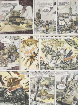remarques: | préface par Palacios sur l'histoire d'Eloy, un combattant républicain durant la guerre civile espagnole 1936-1937 le destin d'Eloy commence au siège de l'Alcazar de Tolède (alcazar = palais fortifié) en septembre 1936 sous le commandement d'Enrique Lister (5ème régiment des milices de Guadalajara) les défenseurs de l'Alcazar ne cèdent pas en attente de renforts phalangistes et malgré plusieurs contre-attaques, les républicains ne peuvent pas repousser les phalangistes et doivent lever le siège de l'Alcazar retour à Madrid qui est bombardée par les phalangistes, des relations diplomatiques sont maintenant établies par les républicains avec les soviets >> p. 37 la pasionaria, la mère communiste les républicains recoivent les premiers tanks soviétiques (15 T-26) alors que les phalangistes approchent de Madrid, arrivée des brigades internationales pour la défense de Madrid >> chroniques de la guerre civile espagnole racontées de façon réaliste par Palacios, des illustrations violentes et tragiques avec des couleurs "énergiques" et dégradées |