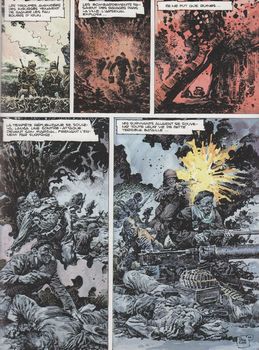 remarques: | rétrospective juillet 1936 à Euskadi en pays basque où le général Mola prend la tête du soulèvement phalangiste (avec les "requetes" = légionnaires africains) contre les républicains, Gorka et Chipiteguy tentent de rejoindre les lignes républicaines, mais seul Gorka réussira à atteindre l'état-major républicain à Irun, bataille de San Sebastian, les phalangistes sont refoulés, toutefois Tolosa tombe aux mains des rebelles qui se rapprochent d'Irun >> p. 35 bataille de San Marcial gagnée par les phalangistes rebelles dès lors Irun est encerclée, la population essaie encore de franchir la frontière vers la France et le 5.9.1936 Irun est occupée par les phalangistes >> p. 42 l'incendie d'Irun >> dernier et troisième volet de la trilogie sur la guerre civile espagnole, cette fois l'action se passe en pays basque où la situation politique était mitigée un épisode toujours bien raconté et magnifiquement illustré par Palacios |