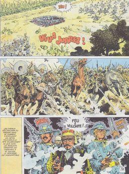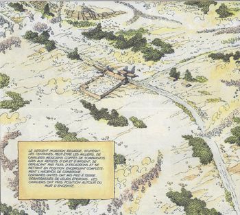 remarques: | 1883, Fort Apache, Maxi, le compère de Mac Coy se marie avec Eleonore et Mac Coy en profite pour narrer au colonel Hood comment lui et Charley ont fait connaissance de Maxi au Mexique en 1863 en fuite lors de la guerre de Sécession, Mac Coy et Charley s'engagent dans les troupes françaises du colonel Dupin qui luttent contre les guérillas juaristes, mission pour Mac Coy: prévenir une troupe de légionnaires, commandés par le capitaine Danjou et partis en reconnaissance, que ceux-ci vont tomber dans une embuscade, Mac Coy et Charley retrouvent les légionnaires à Camerone mais trop tard, ils sont déjà encerclés par les juaristes du colonel Milan, il ne reste plus aux légionnaires que de se défendre bravement >> p. 23 l'attaque des cavaliers juaristes et la formation en carré des légionnaires >> p. 28 Danjou jure sur sa main de bois de tenir jusqu'à la mort après la charge de cavalerie des juaristes, les légionnaires se retranchent dans une hacienda et le 30.4.1863 à 19.00 heures après 10 heures de combat, il ne restera que 3 légionnaires survivants, le colonel Milan dira: "pero no son hombres, son demonios" Mac Coy et Charley déguisés en mexicains et envoyés pour chercher du renfort seront immobilisés jusqu'à la nuit et assisteront malgré eux à la bataille, puis dans la nuit réussiront à prendre le large >> une fresque fidèle à l'histoire et bien exécutée, un bon texte de Gourmelen et de magnifiques illustrations de Palacios, un très bon album avec une jolie couverture |
