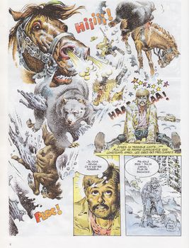 remarques: | 1884, dans les monts Escabros enneigés, Mac Coy est agressé par un grizzly, il s'en sort mais perd cheval et équipement, rejoignant la piste de Fort Apache, il est recueilli par la diligence qui est peu après attaquée par les mescaleros, les occupants se réfugient dans un relais Mac Coy accompagné de Miss Cathe tentent une sortie pour chercher des renforts, sur leur route ils retrouvent la malle que transportait la diligence et l'emportent avec eux (à pied!), ils sont alors à nouveau attaqués par un parti de mescaleros et Miss Cathe est violentée, mais Mac Coy réussit à les abattre et soudain la diligence vient à leur rescousse, Mac Coy veut ouvrir la malle, mais il se fait emporter par les sortilèges de la malle ce n'était toutefois qu'un affreux cauchemar et Mac Coy rencontrera plus tard la diligence qui roule sans histoire vers Fort Apache, mais sans aucune malle >> p. 27 la garce de malle et son histoire >> p. 36 Mac Coy qui a l'air aussi mort qu'une tranche de pâté de porc >> un album de fantaisie très moyen tant pour le graphisme que pour le texte, il n'y a pas que la malle qui est atteinte par des sortilèges |