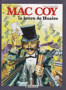 remarques: | album dédicacé avec dessin par Gourmelen 1896, état de Sonora, une bande d'outlaws veulent dévaliser la banque de Hualco, mais se font piéger par les "rurales" un envoyé du président US arrive à Fort Apache avec la nomination de Mac Coy comme capitaine qui passe maintenant sous les ordres directes du service secret du président, Mac Coy est chargé de récupérer dans les coffres de la banque de Hualco une lettre cachetée importante pour la sécurité des USA en traversant les marais del Mosquito, Mac Coy rencontre le bourreau chargé d'exécuter les outlaws survivants du raid de Hualco, Mac Coy le met hors d'état de nuire et se déguise en bourreau >> p. 18 Mac Coy déguisé en bourreau pour s'emparer de la lettre, Mac Coy sème la pagaille à Hualco et réussit à s'emparer du document en emportant également une forte somme d'argent sur le chemin du retour, il retrouve le bourreau qui n'a pas d'autre choix que de le suivre pour éviter des poursuites par les mexicains, grande bagarre aves les poursuivants mexicains dont Mac Coy se débarrasse en leur jetant l'argent dérobé à la banque, retour aux USA où Mac Coy apprend le contenu de la lettre = la formule du 7X = le dosage d'une boisson révolutionnaire qui deviendra le coca cola et qui rendra son détenteur très riche >> la série commence à prendre du plomb dans l'aile par manque d'imagination, si le graphisme reste encore valable, le récit vaut moins cher que la recette du coca cola |