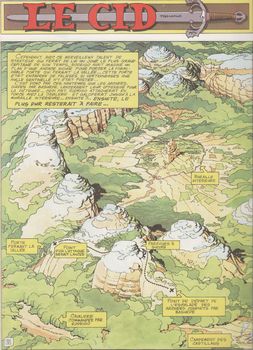 remarques: | tome 1 "le château maudit" couleur, 48 pages dans la collection Aventures et Voyages, le tome 2 "le pélerin de la mort" ne paraîtra pas et sera compris dans l'épisode complet publié dans la collection noire des Humanoides Associés les exploits médiévales du Cid Campeador bien dessinés par Palacios 1063 Espagne médiévale, lutte entre chrétiens et arabes, l'infant Don Sancho, fils du roi de Castille Ferdinand accompagné de son écuyer Rodrigo Diaz de Bivar qui deviendra célèbre sous le nom de Cid Campeador (chef militaire) rencontrent la jolie dame Usua qui les invite dans son château > p. 15 l'histoire de la gente dame Usua mais les deux compères se rendent vite compte que dame Usua n'est pas maîtresse dans son château et sont faits prisonniers par le seigneur Adolfo et ses complices maître Pacomio et la sorcière Burunda, toutefois, avec l'aide du serviteur-géant muet mais fidèle d'Usua, Rodrigo réussit à sortir du château et à appeler à la rescousse l'armée castillane. >> p. 25 le plan d'attaque sur le château Don Sancho sera libéré, mais Usua est tuée par l'affreux Adolfo, les castillans mettent alors le feu au château qui sera complètement détruit, tooutefois le rire démoniaque d'Adolfo continue de retentir dans la nuit >> un des premiers récits de Palacios, le scénario semi-tragique et semi-comique en est à ses débuts, mais le graphisme prend déjà le style particulier de Palacios avec des couleurs aussi flamboyantes que les flammes de l'incendie du château maudit |