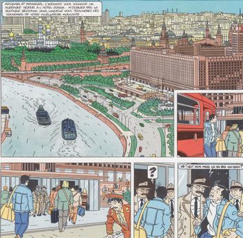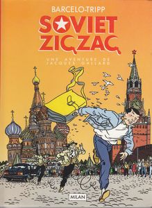 remarques: | Jacques Gallard gagne un voyage à Moscou, mais à son arrivée, il est confondu avec un autre individu et est arrêté, toutefois après plusieurs mésaventures, il parviendra à s'en sortir >> p. 14 la fuite dans le métro moscovite Gallard se réfugie chez Hélène, une amie en stage à Moscou qui lui apprend que Gallard est le sosie du champion d'échec russe Moï Drouk qui doit livrer un combat d'échec avec Vania Vatchécou, un émigré russe devenu américain, ce combat d'échec doit symboliser une politique de fraternisation entre les deux pays, entretemps, Moï Drouk a disparu d'où l'activité du KGB pour le retrouver mais avec l'aide de Vatchécou, les américains veulent faire émigrer le champion soviétique Moï Drouk vers les USA et à cet effet veulent utiliser le passeport de Gallard d'où nouvelle difficultée avec les agents américains, mais à la dernière minute, Moï Drouk refuse de quitter l'URSS >> il en résulte alors un parfait quiproquo qui déroute pleinement le lecteur, le texte est complètement loufoque et le scénario de Barcelo parfaitement incompréhensible, seul le graphisme de Tripp, genre ligne claire avec un bon coloriage, donne un côté positif à l'album |