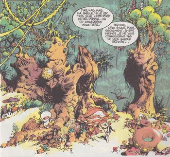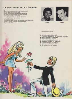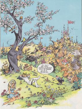 remarques: | à Hallucinaville, les choses ne sont plus ce qu'elles étaient, tout devient ordonné et méchant, Olivier et ses amis se rendent au château des quatre lunes où se trouve le grand pas-sage Ebouriffon pour éclaiçir la situation, ils constatent que de plus en plus, les habitants de Rêverose reçoivent des doubles de mauvais caractère contrôlés par les Schnarkbuls, des êtres nuisibles pour y rémédier, il faut détruire le miroir à trois façes qui fabriquent ces doubles >> p. 19 le piège du miroir à 3 façes eet pour cela, il faut se rendre à la forêt de pas-permis où se trouve le fameux miroir >> p. 32/33 la forêt de pas-permis avec l'aide du vampire courandaire, Olivier réussira à neutraliser le miroir à 3 façes >> p. 44/45 la lutte d'Olivier contre le miroir >> à nouveau un album de rêves noirs cette fois au lieu de rêves roses, le graphisme est toujours bien exécuté mais à la longue, rêverose pourrait bien devenir névrôse |