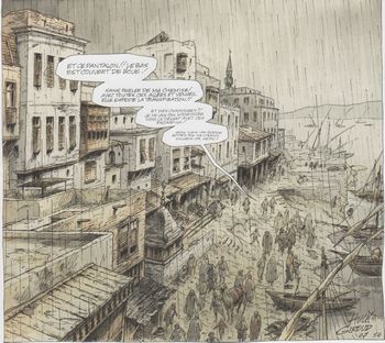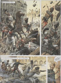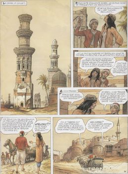 remarques: | la suite des péripéties de Benjamin Fleury-Nadal selon le volume VII du Décalogue "les conjurés" volume où Benjamin fait la connaissance de sa future femme: Aurore Beauchamp avec qui il aura deux enfants Philippe et Hélène la quête amoureuse Paris 1830 sous le règne de Charles X, trois hommes deviennent amis sur les barricades: - Benjamin Nadal, étudiant à polytechnique - Emile Heurteux, professeur de mécanique, dit l'Enfantin - Hippolyte Lecomte, artiste-peintre >> p. 10 la découverte du portrait de Ana Luna, une inconnue dont Benjamin tombe amoureux et qui va changer sa vie 1834, pour sa passion pour l'Egypte et de par l'aventure de son oncle Eugène, Benjamin oeuvre comme ingénieur en Egypte et utilise ses loisirs sur les traces des aquarelles de Denouettes comme mentionnées dans le livre "Nahik" >> p. 20/21 quelques belles aquarelles sur le Nil et le Caire Ana Luna apparaît toujours encore dans ses rêves et il croit la reconnaître un jour sur les bords du Nil et finalement le rêve de Benjamin devient réalité, il retrouve Ana Luna mais ce n'est plus Ana Luna qui est décédée entretemps mais sa fille Aurore fille du pacha français Armel Beauchamp et qui ressemble étrangement à sa mère Ana Luna, une espagnole mariée à Beauchamp durant la guerre d'Espagne Benjamin devient le soupirant et le confident d'Aurore >> p. 38 mention du Nahik possédé par Benjamin Aurore lui révèle qu'elle a écrit un roman dont le sujet est un archéologue qui a découvert la tombe mystérieuse d'un pharaon inconnu mais le roman n'est pas fini et Aurore en mal d'inspiration part seule sur le site de Wadi Souf où se trouverait la tombe du pharaon inconnu toutefois la région est dangereuse et Benjamin avec l'archéologue Laroque, le docteur Ollier et le guide Djasir partent à la recherche d'Aurore >> un nouveau épisode de la série complémentaire "les Fleury-Nadal", cette fois on décrit l'origine des relations entre Benjamin Fleury-Nadal et Aurore Beauchamp (qui mourra peu après de dysenterie en laissant à Benjamin deux enfants: Philippe et Hélène >> voir tome XI du décalogue dans lequel Benjamin trouvera le labyrinthe de Thôt et Smina, fille de Nabila, qu'il épousera en seconde noce, ouâh'ad fi'arkou khams, quelle histoire!!) le récit est assez bien élaboré mais surtout le graphisme de Hulet se prête très bien à cette épisode avec quelques magnifiques planches d'égyptologie et >> p. 39 de nouveau l'amour des livres |