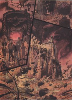 remarques: | retrospective du drame qui s'est joué dans la maison morbide et explication: le mari de la concierge a en fait assassiné leur fils Simon (similitude entre Charles et Simon) entretemps Charles se retrouve emprisonné dans les caves de l'immeuble, ses amis, venus à sa recherche, sont l'objet d'hallucinations collectives qui leur font perdre la raison alors que Charles après être tombé sur des ossuaires et une mystérieuse vierge noire se retrouve à son point de départ avec la porte de sa prison ouverte >> le graphisme reste toujours de bon aloi, mais le scénario commence à devenir très très compliqué et se perd dans de macabres dédales, ce n'est pas le passage avide, c'est le passage à vide le seul vrai point positif reste la couverture d'album qui est superbe |