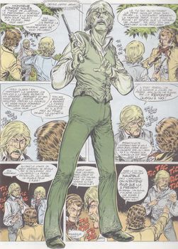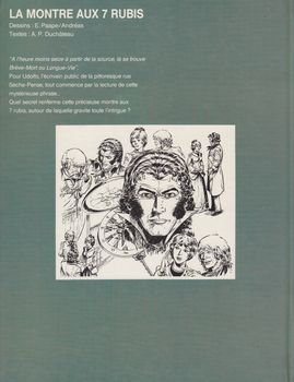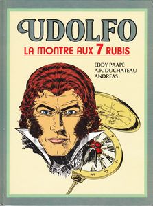 remarques: | un album à deux épisodes 1) la montre aux 7 rubis au XVIIIème siècle, l'écrivain public et détective Udolfo avec son assistant Tirelire sont contactés par Clarissa, une jeune femme traquée par le gang du notaire qui veut lui ravir la montre aux sept rubis détenue par l'horloger Nicolas, père de Clarissa >> p. 14 la montre aux 7 rubis qui marche à l'envers ce qui permet à son détenteur de ne pas vieillir Udolfo éclairçira le mystère de la montre aux 7 rubis (qui n'est qu'en fait qu'un genre de compteur Geiger) et démantèlera le gang du notaire 2) le grimoire de Lucifer Udolfo à la recherche du grimoire de Lucifer dont la formule permet de transformer de vulgaires cailloux en pierres précieuses, malheureusement le grimoire sera détruit dans l'incendie d'un vieux moulin épilogue: Udolfo n'est autre qu'un voyageur du temps (venant du futur en 2089) avec son assistant Gabo et son assistante Anyelle, ceux-ci s'amusent à voyager dans le temps et à redresser quelques torts (mais normalement un voyageur du temps ne doit pas intervenir sur le passé), son prochain rendez-vous serait avec Dracula, mais un album prévu à ce sujet ne paraîtra jamais et il n'y aura qu'un seul album de la série Udolfo avec le duo Paape et Duchâteau >> un graphisme très bon de Paape, mais un texte pas très élaboré malgré une bonne idée de base, il est possible que le début de cette série ait été conçue pour concurrencer la série de Luc Orient qui ne put d'ailleurs pas être égalée, la série Udolfo fut donc par la suite abandonnée n.b. il existe une première édition en N&B (1980) par les éditions Jonas |