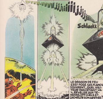 remarques: | album cartonné, 46 pages Sectan, tyran de Terango, s'apprête à recevoir un nouvel allié pour sa lutte contre les dissidents, il s'agit du dr. Julius Argos et sa horde de primitifs, celui-ci, après avoir localisé la base des rebelles avec les globes de destruction, imagine un plan diabolique: engager ses primitifs après un traitement spécial qui les rend pratiquement invulnérables façe aux armes des teranghiens et ils seront soutenus par des robots armés qui formeront une forêt d'acier >> p. 10 une arme terrible: le poing de feu >> p. 30 la forêt d'acier en marche (des capsules d'assaut) mais ceux-ci seront finalement vaincus par le prof. Kala qui réussit à crééer des ondes-radio qui dérèglent le fonctionnement des robots et qui redonnent la raison aux primitifs, cette fois Argos et Sectan connaîtront une défaite complète >> p. 38 la guerre des ondes >> fin du premier cycle des aventures de Luc Orient sur Terango, un scénario à gadget, mais plein d'action avec surtout un bon graphisme et coloriage |