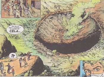 remarques: | album cartonné EO, 46 pagtes à Eurocristal 1, le laboratoire de recherches le plus avancé du monde, le prof. Kala enregistre la chute d'un météorite dans un village alpin, après une analyse plus complète, il semble que ce ne soit pas seulement un météorite, mais un vaisseau spatial et des choses étranges se déroulent dans le petit village, notamment des gens sont frappés de folie >> p. 8 le cratère aux sortilèges après examen, le prof. Kala constate qu'il s'agit non d'extraterrestres, mais d'un champignon vénéneux de l'espace qui répand un nuage verdâtre frappant de folie les gens qui en sont touchés, heureusement, le service sanitaire d'Eurocristal y mettra bon ordre en effectuant un nettoyage général >> p. 45 après le gaz hallucinogène qui rend fou, >> p. 45 la fumée de la pipe du prof. Kala et hommage aux japonais qui les premiers ont identifié le gaz qui rend fou et qui aurait aussi frappé le Japon >> un scenario qui part sur les chapeaux de roue, mais qui se dégonfle un peu vite vers la fin, tout en restant assez intéressant avec de bons commentaires et un graphisme convenable |