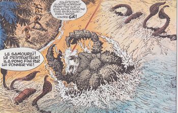 remarques: | à Eurocristal, Luc Orient et ses amis sont confrontés avec un problème de monstres préhistoriques artificiels, ils partent pour une vallée perdue de Borneo d'où ces monstres seraient originaires >> p. 10+41 rencontre avec des monstres dont une pieuvre gigantesque et un tyrannosaure Rex rencontre aussi avec Nathan Gold, ingénieur-technicien et l'inventeur de ces monstres artificiels, mais son associé le savant Wolfgang Rafaël est devenu fou et a commencé à manipuler les monstres sans but réel, Luc Orient et Nathan Gold réussiront à éliminer Rafael et ses monstres grâce à l'énergie K >> p. 44 le monstre ultime: le samouraï destructeur >> un album au scenario monstrueux mais assez captivant avec quelques strips à sensation et un bon graphisme, fin du deuxième cycle des aventures de Luc Orient |