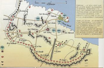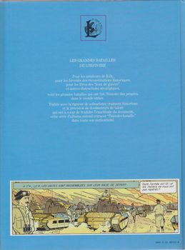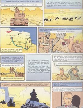 remarques: | série documentaire sur la 2ème guerre mondiale dessinateur: Brice Goepfert (principal) et Marc Dekeister, scénariste: Bruno Jean-Faure les campagnes d'Afrique du Nord, opération Compass (mise en déroute de l'armée italienne et de la Regia Aeronautica), arrivée en février 1941 du DAK (deutsches Afrika Korps) avec Rommel opérations Battleaxe et Crusader, les évènements de Malte, Tobrouk, Bir Hakeim, El Alamein, campagne finale de Tunisie >> p. 26 le plan de la forteresse de Tobrouk n.b. le "jerry" = surnom donné aux allemands par les anglais provenant du nom anglais jerrican (en allemand: Wehrmacht-Einheitskanister) pour désigner un bidon pour carburant en acier, inventé en Allemagne en 1936 et mis en service en grand nombre dans les unités mécanisées de la Wehrmacht, dès 1940, il fut copié et adopté par les armées de tous les belligérants >> un bon résumé de la guerre du désert 1941-1942 et bien fidèle à la réalité avec de bonnes cartes qui permettent de suivre l'évolution des opérations militaires, le graphisme n'est toutefois pas terrible, mais respectable (surtout la carte de Tobrouk) |