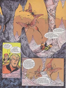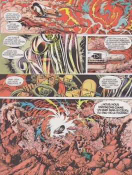 remarques: | continuation de la saga porte de cristal sauf que le prof. Kala a repris son état normal en modifiant le temps le Jabrakk, vaisseau spatial des Dartz, est en route pour Terango , mais une panne d'ordinateur provoque un début d'intoxication, de plus, un manque d'eau oblige les voyageurs à effectuer une escale sur une planète inconnue = Roubak, surnommée l'enclume de la foudre à cause de ses terribles orages magnétiques >> p. 4 description du contingent terrestre sur le Jabrakk >> p. 10 Lora empoisonnée, mais que devient-elle? il y a de l'eau sur Roubak, mais elle est particulièrement difficile à trouver >> p. 24/25 les curieux papillons de Roubak rencontre avec les habitants de Roubak (un homme et une femme = seuls survivants de la catastrophe qui a frappé Roubak) >> p. 40 les orages magnétiques de Roubak grâce à l'intervention du prof. Kala qui utilise les canons ioniques du Jabrakk, les orages magnétiques sont transformés en pluies torrentielles qui changent complètement la topographie de Roubak et maintenant avec de l'eau en abondance, le Jabrakk peut continuer sa route vers Terango >> un album intéressant surtout de par le graphisme et idem pour le scénario avec quelques bonnes idées dont la renaissance d'une nouvelle planète, thème de l'exploration spatiale |