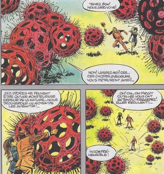 remarques: | album consistant de quatre nouvelles effectuées par trois scénariste différents a) les spores de nulle part (Paape + Greg) Luc, Kala et Lora à la recherche de spores géantes signalées dans une forêt et après avoir détruit le maître des spores controlé par des extra-terrestres, les spores de nulle part quitteront la Terre b) les rayons de feu du soleil (Paape + Jourd'huy) la terre connait une vague de chaleur sans précédent qui indispose beaucoup les terriens mais lors de l'arrivée de trois extra-terrestres en exploration sur la Terre, ce climat horride découragera les extraterrestres de venir s'établir sur la Terre et ils repartiront dans l'espace tandis que le prof. Kala s'attache au dure problème du réchauffement planétaire c) la vengeance (Paape + Greg) une équipe d'explorateurs spaciaux rapportent d'un de leurs voyages, des peintures effectuées à l'aide de matériaux trouvés sur une planète inconnue, lors d'un vernissage de ces tableaux, les visiteurs sont frappés de folie, celle-ci causée par une poussière maléfique aux effets hallucigènes dégagée par les tableaux, ce serait la vengeance des dieux de la planète d'Akkaton, explorée par le groupe des visiteurs terriens, en quelque sorte, une malédiction de pharaons extra-terrestres d) mission en 2012 (Paape + Andreas + Duchâteau) cette fois le héros n'est plus Luc Orient, mais Barry Kim, un agent temporel indépendant avec son adjointe Carole, qui est chargé d'une mission dans le passé (un crime resté impuni), l'agent découvrira que c'est le chef des agents temporels qui est l'auteur du crime , mais le chef a choisi l'agent Barry en sachant que celui-ci va vouloir dénoncer son chef, mais il n'y arrivera pas, car il sera victime d'un accident mortel peu après, et c'est son adjointe Carole qui finira le travail en éliminant le chef dont le crime est resté impuni, une histoire tirée un peu par les cheveux temporels >> un album d'expérimentation sans prétention et sans grand intérêt, il semble que le dessinateur Paape ait adapté son graphisme au style propre des scénaristes qui eux ne présentent que des scénarios pas très recherchés |