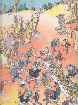 remarques: | de nombreux gags de cimetières (genre Gaston le fossoyeur) dont les meilleurs: - p. 4 le python tout en long - p. 9 le canari tout en petit - p. 13 les tombes des créateurs de BD - p. 22 la mort du ver solitaire - p. 27 le sens de la justice - p. 30 référence à Popeye (Eyepop) - p. 37 Blanche-Neige et ses 7 nains - p. 42 le feu follet (explication = réaction fugitive avec l'air de gaz s'échappant de matières en décomposition) - p. 46 le mot de la fin: le monde est fou >> un début prometteur sur une idée originale et qui comprend beaucoup de thèmes et sujets dont ceux de BD tels Spiderman, Blanche-Neige, l'homme invisible et naturellement Dracula) il y a en tout 33 albums de ce genre (1986 à 2016), mais seul le tome 1 est collectionné ici comme exemplaire représentatif |