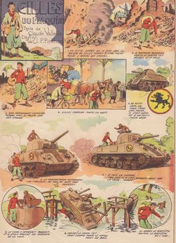 remarques: | péripéties d'un jeune homme durant la campagne de France 1940, puis engagement dans le maquis toulousain et auvergnat, diverses opérations secrètes à Bordeaux et Paris >> p. 10 la farce de Gilles sur le convoi allemand (des clous) >> p. 24 prisonnier d'un boche bestial >> p. 26/27 l'imprimerie clandestine camouflée dans une fabrique de nougat >> p. 29 les boches dans Paris à la fin du récit, Gilles sera décoré et retrouvera ses parents >> un récit pas très élaboré mais amusant, les récits de Gilles rappellent un peu ceux de Bernard Chamblet mais raconté avec un peu plus d'humour, on remarque toutefois encore dans le récit les ressentiments contre l'occupant d'hier (les boches) >> assez bon graphisme par le dessinateur de Bécassine et signé aussi pour le scénario par Cloval (= Claude Valelle), un album quelque peu satirique et à la gloire de la résistance n.b. dans la même collection: Olive et Bengali, Gringalou, Suzel, Frimousset, Grassouillet (dessins par Pinchon) Mowg fils de la brousse et l'or des Omahas (Chott), le seigneur d'Ahaggar (Le Rallic), ces trois derniers albums sont collectionnés ici |