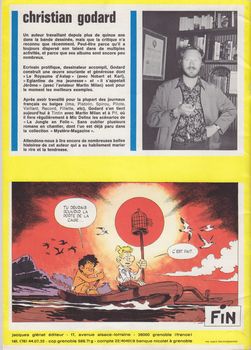 remarques: | 1) entretiens de Numa Sadoul avec Godard, (1932-2024), débute avec Pip et Joc chez les éditions Rouff, puis chez Vaillant-Pif, Pilote et Tintin, collabore avec Ribera pour "le vagabond des limbes" ainsi qu'avec Delinx pour "la jungle en folie", aurait voulu devenir écrivain ce que l'on remarque dans les récits de Godard = de la littérature en BD 2) les aventures de Norbert et Kari = satire de la vie moderne et beaucoup de sentiments dans ces récits où Godard traduit le monde de l'enfance à la recherche du paradis perdu = l'île de Taatatatah( petite allusion au film "la guerre des boutons" et à "Peter Pan"), conflit aussi des générations (les zozos et les trumeaux), son meilleur album: "le monde d'Astap" 3) les aventures de Martin Milan avec 2 facettes: tendresse et amertume, avec également d'excellents calembours, toutefois sans excès, peut'être son meilleur album "les hommes de la boue" 4) anthologie des BD ratées par Godard 5) "les enfants de Tanga" = nouvelle de SF inédite (mais macabre) par Godard 6) bibliographie de Christian Godard (1972) >> un cahier surtout intéressant de par les entretiens avec Numa Sadoul |