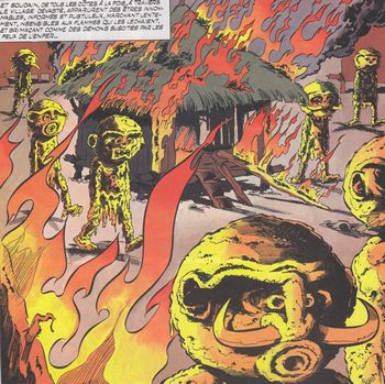 remarques: | Nouvelles Hébrides, état d'Hekzéma, Ettore Ticoli, ministre des finances prend la fuite avec la caisse de l'Etat après en avoir versé le montant sur son compte de banque suisse, mais il est pourchassé par les sbires de Sycophanto, ministre de la police >> p. 17 la fripouille logique (avec le no 32847 du compte suisse dans sa cervelle) Ticoli loue les services de l'avion-taxi de Martin Milan qui le conduit sur l'île de Rampono dirigée par papa Knock et ses tontons knock-out, soupconnés par papa Knock, Martin et Ticoli réussissent à s'enfuir avec l'avion-taxi, mais à court de carburant, ils doivent se poser sur l'île vierge de Yadkoa Anbavé où ils trouvent des indigènes qui, conduits par le prophète Amadou Toumouyé attendent l'arrivée du dieu-cargo >> p. 34 le savoir et l'espérance ne cohabitent pas toujours facilement dans le coeur de l'homme (le prophète philosophique dixit) >> p. 39 le dieu-fric et le dieu-cargo mais à la place du dieu-cargo, ce sont les tontons knock-out qui débarquent sur l'île et qu'ils mettent à feu et à sang, Martin Milan prend les choses en main et transforme les indigènes en êtres surnaturels avec une tête-masque confectionnée avec un cucurbitacé modelé avec de la terre glaise, des plumes, des dents et des cornes d'animaux (un genre halloween), ce seront les hommes de la boue qui causeront la frayeur parmi les tontons knock-out qui déguerpiront à toute vitesse et les indigènes auront trouvé leur dieu-cargo en la personne de Martin Milan >> un très bon album, un bon graphisme et un scénario du tonnerre, moraliste et humain, une petite merveille malgré des gags un peu surfaits, mais d'une grande originalité et aussi une jolie couverture d'album >> petite critique aussi des états-bananes et des banques suisses n.b. les autres albums de la 2ème série Martin Milan (non collectionnés ici): - no 5 l'enfant à la horde (1981) - no 6 il s'appelait Jérôme (1982) - no 7 une ombre est passée (1982) - no 9 destination guet-apens (1984) - no 10 l'ange et le surdoué (1985) - no 11 Eglantine de ma jeunesse (1986) - no 12 le cocon du désert (1995) >> 9 ans après - no 13 la goule et le biologiste (1997) = dernier album de la 2ème série il y eut toutefois une première série de 5 volumes brochés (1971 à 1975) édités par Lombard, collection Jeune Europe, repris dans la 2ème série |