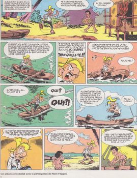remarques: | sur leur île, Norbert et Kari sont approchés par le dauphin Demosthène qui parle comme un perroquet et qui cherche de l'aide pour son maître qui a été enlevé, Norbert et Kari se rendent alors sur l'île du vieux sorcier fou où ils découvrent que le vieux sorcier a été enlevé par le maître des abysses: Thémistocle Amaury Philarète Ducroc-Manzome, un biologiste réputé devenu mégalomane qui veut devenir maître du monde en fabriquant des répliques de lui-même (des ditos) qui sont employés à rechercher des diamants dans les fonds marins Kari avec la tenue de combat Hardyman qui le rend 40x plus fort qu'un humain réussira à supprimer les plans du savant fou, mais il faudra encore le sacrifice du dauphin Demosthène pour éliminer le savant >> p. 9 l'étude sur les dauphins = animaux très intelligents, d'ailleurs dans cet album, moins consacré à l'humour et aux calembours, Godard se réfère (en 1975) à plusieurs inventions plus ou moins réalisées à ce jour tel le clonage >> album mêlé de SF avec une fin plutôt cruelle et un humour toujours godardien, mais dans les aventures de Norbert et Kari, c'est bien Kari le petit polynésien qui est la figure marquante et le moteur de la série n.b. il y aura encore 5 albums de Norbert et Kari par Godard publiés de 1981 à 1989 , principalement par les éditions Glenat (mais qui ne seront plus collectionnés ici): - tome 5 l'élection (1981) - tome 6 la pierre de nulle part (1981) - tome 7 un empire sur pilotis (1982) - tome 8 du rififi au pays des otaries (1982) - tome 9 la maison du kloune (1989) aux éditions vaisseau d'argent qui publient aussi le "vagabond des limbes" |