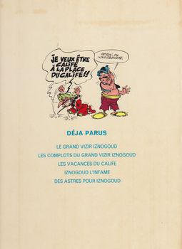 remarques: | 1) la machine géniale l'ordonnateur fabriqué par Ibéhem, le magicrate lors du mariage du 37ème fils de Haroun el Poussah avec la 42ème fille de Pullmankar 2) la route qui ne va nulle part point d'issue pour Iznogoud 3)le terrible doreur le doreur Lamibidas qui transforme les personnes en statue plaqué d'or, un drôle de statut 4) le sceptre du calife le symbole de souveraineté du calife menacé par le voleur Cleptomahn engagé par Iznogoud 5) l'onguent mystérieux apporté de l'Occident par Itsnotsobad, le marin = du dentifrice et du déodorant >> un album superbe tant pour le scénario que pour le graphisme, Tabary et Goscinny au sommet de leurs prestations, imprimerie de France, Choisy-le-Roi |