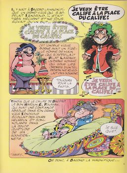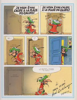 remarques: | 1) le revenant de la revue l'histoire des califes devenus fous pour un meurtre ignoble sur un soldat lors d'une revue, Iznogoud veut faire revenir le revenant pour qu'il frappe le calife de folie >> p. 13 la résidence secondaire: Sam Suffi 2) scandale à Bagdad l'homme par qui le scandale arrive et qui propose de renverser le calife en causant un scandale qui le concerne: un enfant illégitime abandonné, mais le calife adoptera tous les enfants abandonnés 3) musée de cire la salle des assassins où Iznogoud redonne vie à l'un d'entre eux pour faire assassiner le calife 4) le coussin goulu par une petite annonce, Iznogoud découvre un inventeur capable d'éliminer le calife en utilisant un coussin gonflable 5) les oeufs d'Ur Iznogoud cherche à s'allier les faveurs de l'armée pour renverser le calife en l'achetant grâce à une autruche qui pond des oeufs d'or n.b. les oeufs d'or d'Ur >> p. 42 la position la mieux assise ne résiste pas au pal >> dernier album produit par le tandem Tabary/Goscinny, ce sont aussi les derniers vraiment bons gags de la série avec un graphisme qui reste toujours aussi bon n.b. à partir de cet album, les pages de garde changent de graphisme >> 4ème plat, épitaphe à René Goscinny par Tabary |