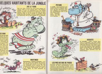 remarques: | recueil de petits sketchs animaliers et humoristiques, album divisé en plusieurs épisodes dont le premier est le plus long et le meilleur les acteurs (animaux de la jungle): - Joe le tigre - Gros Rino - Mortimer, le serpent à lunettes - Potame, le toubib hippopotame - Auguste, le crocodile-poète et les pies de bas de pages 1) la crise (économique et sociale) quelques bonnes allusions de philosophie sociale et économique mêlées d'humour et de sarcasme avec >> p. 28 Paulo, l'homme de sciences et économiste 2) l'oeuf de côlon ou l'histoire de l'oeuf en bois de buis pour repriser les chaussetttes 3) c'est le luth final avec Torturette, la tortue boxeuse 4) le quartier de la défense (la défense des défenses dont on fait des boules de billard) 5) la bêtise du cambré = le pinguin volant 6) graines de violence (couper le mal à la racine en l'occurence une plante carnivore) 7) le hérisson hérissé à qui on a vendu par erreur de la crème dépilatoire 8) un ver de trop (le ver solitaire qui cherche une nouvelle habitation) 9) excès de z-ailes (les malheurs du cheval pégase) >> de bons petits récits agréables à la lecture de qualité moyenne mais scénario bien animé, prépubliés dans "Pif Gadget" en 1970, il a été publié 20 albums format normal de 1973 à 1988 dont le premier "Joe le tigre" (1973) et le dernier "la guerre du Golf" (1988) ainsi que 11 volumes format 16/22 de 1978 à 1984, un seul volume 16/22 collectionné ici à titre d'exemplaire représentatif de la série Information Mic Delinx de son vrai nom Michel Houdelinckx, 1930-2003 dessinateur animalier, genre Macherot, mais au trait plus vif et ironique |
