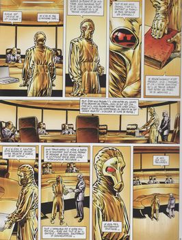 remarques: | résumé de l'histoire d'Abeau et de Cylinia, sa soeur et de la famille de Roquebrune en 1269 (>> voir le clan des chimères) dont les terres abritaient les stryges, ils reçurent l'immortalité depuis les stryges en devenant leurs alliés et en conservant le grimoire qui avait été écrit par Bertaire, l'inquisiteur et par le nonce Venoncius, tous deux frappés de folie, le grimoire ne peut être détruit mais en d'autres mains peut être utilisé contre les stryges en outre, les stryges avaient demandé à Abeau et Cylinia de combattre avec eux l'alchimiste Weltman qui avait rompu le pacte passé en son temps entre lui et les stryges >> p. 3/4 le chef des stryges dissidents = le cornu = le diable qui avait été rejeté par le clan des stryges et qui avait cherché à prendre sa revanche Abeau et Cylinia soutiennent les stryges, car ceux-ci ont aidé l'humanité à se développer, ce ne sont donc pas des êtres malfaisants car ils ont transmis la conscience et la connaissance à l'homme, mais à présent la race des stryges est menacé d'extinction par un virus mystérieux qui les a infecté en son temps et le seul but maintenant pour Abeau et Cylinia est de reprendre à Weltman le grimoire dérobé par Reese, son homme de main Kevin, pour guérir Melly, demande l'aide de la guérisseuse Cylinia mais celle-ci ne peut rien faire contre ce mal >> p. 12 une cheminée originale >> p. 13 les effets du "baiser de l'oubli" = un acide qui provoque le dérèglement de la glande thyroïde et un désordre hormonal, c'est un peu le secret du "chant des stryges" >> p. 14 les proportions en % des personnes frappés par le baiser de l'oubli: 24% des sujets frappés perdent subitement la raison, 30% parviennent à refouler naturellement l'infection au cours d'une période allant de quelques jours à plusieurs années, 2% résistent parfaitement à l'infection, l 'acide ne leur causant aucun effet, 2% succombent quelques heures après le contact et chez 42% (la plupart des cas) l'état de santé psychique et physique des personnes affectées se détériorent inexorablement conduisant à la mort de son côté, Weltman (première apparition officielle dans la série) convoque trois spécialistes de son entreprise chargés de déchiffrer le grimoire et de savoir où se trouve le livre de plomb (mentionné sur une page du grimoire) qui contient la formule pour détruire les stryges Debrah via Jill et via Grace essaie de recontacter Crandl au niveau 1 tandis que Kevin tombe à nouveau dans un traquenard organisé par le prof. Chapman, finalement Debrah réussit à rencontrer Crandl qui ne peut pas l'aider dans sa recherche sur Weltman, toutefois Crandl donne à Debrah l'information suivante: "le domicile d'un aveugle a-t-il besoin de fenêtres?" mais Debrah reçoit aussi un curieux message de Weltman mentionnant: "Crandle-2-Meanings vous ment" entretemps Kevin réussit à se libérer des sbires de Chapman et après avoir rejoint celui-ci, Kevin apprend que les analyses concernant Melly sont effectuées par la compagnie Synthylab à New York (un immeuble dont la facade donnant sur rue est sans fenêtres) où se trouvent peut'être aussi Weltman et Reese ainsi que le grimoire >> p. 38 le chagrin de Jill qui a perdu son amie Grace le trio décide alors d'effectuer un raid sur la Synthylab tandis que les trois spécialistes de Weltman réussissent à déchiffrer le texte contenu dans le livre de plomb: "la table de défixion sera le contenant et le contenu de la solution" mais sont incapables d'en comprendre la signification >> un excellent album qui manipule vraiment le lecteur, le laissant dans le flou malgré plusieurs informations vitales, peut'être le meilleur album du cycle 2 |