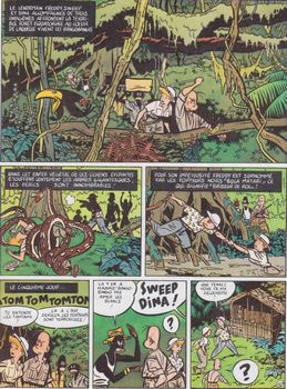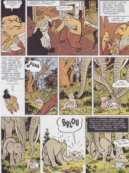 remarques: | album en deux épisodes a) le trio Freddy, Sweep et Dina partent en Afrique avec le prof. Bataxon, collectionneur de plaques photographiques, à la recherche de celle prise avec Livingstone et servant de fétiche à une tribu de noirs, mais ils sont talonnés par Brixton, le rival de Bataxon, alors que le chasseur et trafiquant Stratton doit les conduire chez les Bangobangos qui détiennent la fameuse plaque >> p. 12 dans la jungle, Freddy est surnommé par les porteurs noirs "bula-matari" = briseur de roc >> p. 19 rencontre avec l'aventurière Darnell l'expédition est un échec et nos amis se retrouvent à Paris et pour contenter les deux rivaux, Dina a l'idée de fabriquer une fausse plaque photographique b) à Paris, Freddy fait l'achat d'un tableau représentant "le cimetière des éléphants"; au même moment, un meurtre est commis dans leur immeuble, Broussard, la victime, est un ancien du Congo, le vol n'est pas le mobile du crime, Thorpe, un 2ème ancien du Congo, est aussi assassiné par la suite Freddy découvre l'arme du crime: un poignard bangobango à deux lames, il réussit ainsi à démasquer le meurtrier qui a agit par vengeance >> p. 45/46 l'histoire du meurtrier Kallach, abandonné bébé dans la jungle par ses parents et recueilli par des éléphants dont la plupart furent massacrés par les trafiquants Broussard et Thorpe épilogue: Kallach réussit à s'échapper pour aller mourir au cimetière des éléphants >> deux bons récits intéressants sur fond de polar avec des touches d'humour, deux histoires originales (la deuxième étant la meilleure) et surtout un très bon graphisme c'est vraiment du bon Chaland et probablement le meilleur album de la série |