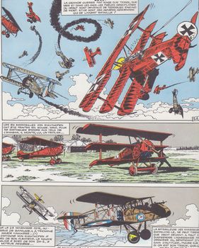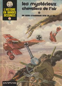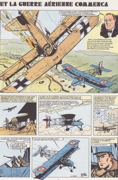 remarques: | tranches de la guerre aérienne de 14-18 en plusieurs épisodes écrites par le scénariste O. Joly et illustrées par différents dessinateurs: 1) et la guerre aérienne commença (by Piroton) un des premiers duels aériens entre un avion français "Voisin" et un avion allemand "Aviatik" 2) Zeppelins contre sous-marins (by Rogé) la flotte allemande accompagnée de zeppelins comme appareils de reconnaissance qui peuvent aussi attaquer des sous-marins et autres navires 3) l'as au triplan rouge (by Piroton) l'histoire de l'as allemand von Richthofen surnommé le baron rouge avec son avion triplan "Albatros" peint en rouge pour mieux le reconnaître et que ses adversaires surnommeront "le diable rouge", chef de la fameuse escadre von Richthofen dont les appareils étaient aussi peints en rouge (pour pouvoir bien les distinguer!), von Richthofen trouvera la mort à 25 ans le 20.4.1918 après 81 victoires 4) les canards affrontent les albatros (by Rogé) les canards = les hydravions, appareils gros et lents (il n'y avait pas encore de porte-avions en 1914), ces "canards" étaient surtout utilisés pour la chasse aux sous-marins mais ils étaient bien inférieurs quand supris par des appareils ennemis du genre "albatros". Le premier porte-avion français apparut en 1927 et fut nommé "commandant Teste" du nom d'un célèbre pilote de "canard" qui fut l'un des promoteurs de l'aviation navale (premier pilote à décoller d'un bateau et à y revenir), il devait disparaître en 1925 en tentant de traverser l'Atlantique. 5) fantôme-as le terrible (by Piroton) 1917 au Chemin des Dames, un mystérieux appareil allemand vient régulièrement mitrailler les lignes françaises en signant ses attaques par "fantôme-as", il sera abattu en mars 1918 mais son identité restera inconnue 6) carnage de zeppelins (by Hardy) le 19.10.1917 11 zeppelins font un raid sur l'Angleterre, au retour détournés par un ouragan, ils sont déportés vers la France, 5 zeppelins sur 11 (dont deux seront abattus à Sisteron et Fréjus) seront détruits, ce raid sonnera le glas des dirigeables. >> un album historique de 48 pages très bien conçu et fort intéressant avec un graphisme très convenable, une série très prometteuse |
