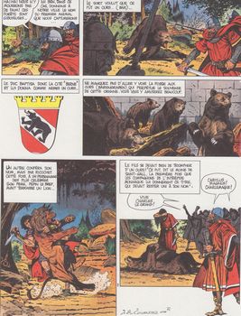 remarques: | des histoires d'animaux en plusieurs épisodes conçues par le scénariste O. Joly et illustrées par différents dessinateurs: 1) chats à l'assaut (by Pascal) en 528 BC, le roi perse Cambyse II use d'une ruse déloyale en utilisant des chats, animaux vénérés par les égyptiens, lors du siège de Pélusium, les égyptiens se rendent pour ne pas devoir blesser ces chats mis en avant par les troupes de Cambyse lors de l'assaut (?) n.b. explications sur les chats que les égyptiens adoraient comme des dieux 2) quand les fauves adoptent des enfants (by Cicuendez) tel Romulus et Remus, Mowgli l'enfant de la jungle et Tarzan 3) le vainqueur et les oiseaux parlants (by Cicuendez) l'histoire du perroquet (rapporté des Indes lors de l'expédition d'Alexandre le grand) et du corbeau à qui on avait apprit à dire: "salut Octave vainqueur" 4) salut, messire longues oreilles (by Cicuendez) l'utilisation des ânes, un animal plutôt intelligent et courageux, mais on ne sait pas bien pourquoi, un homme peu intelligent est considéré comme un "âne" 5) l'esclave et sa tigresse (by Fernan) l'histoire de Phoebe, la tigresse de Néron, qui sauve la vie dans l'arène de sa compagne, l'esclave Actée 6) accusé cochon, levez-vous (by Puig) le jugement des animaux, l'exécution d'un coq à Bâle (1474) et d'une truie à Falaise (1386) 7) week-end chez les ours (by Cicuendez) l'histoire de la ville de Berne qui reçut son nom d'un ours (Bär), l'ours de Saint-Martin et la dénomination "teddy-bear" venant du président Theodore Roosevelt qui adopta un petit ourson à la Maison Blanche 8) voyage dans la préhistoire (by Malik) la fossilation des squelettes de dinosaures (particulièrement dans le désert de Gobi), l'histoire des dinosaures, nom qui veut dire lézards terribles, l'origine du paradis terrestre, l'origine du nom mammouth (= nom tartare = mama = terre) 9) au revoir, cigognes (by Pascal) les animaux comme emblèmes: le lion = force, l'aigle = génie, le coq = vigilance, la cigogne = l'amour maternel (la loi de la cigogne dans la Grèce Antique qui instituait de s'occuper des personnes âgées) 10) opération sauvetage (by Cicuendez) l'amour des humains pour les animaux (mais aussi leur cruauté envers les animaux), la reconnaissance de Plutarque pour les vieux chevaux, le lion d'Androcles, création en 1824 à Londres de la première société protectrice des animaux >> un album assez intéressant en tout cas très amusant et peut'être en partie véridique avec un bon graphisme |