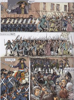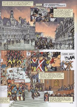 remarques: | on est le 15 nivôse de l'An II, 4 janvier 1794 d'après le calendrier républicain créé par Fabre d'Eglantine et utilisé en France de 1793 à 1806 après Toulon, Buonaparte est promu général, puis mis aux arrêts par le Comité de Salut Public en janvier 1794, 6.4.1794 début du régime de la Terreur avec les 2 frères Robespierre, St-Just et Couthon 30.3.1794 condamnation à mort de Danton et Desmoulins, grâce à Augustin, dit Robespierre le Jeune, frère de Maximilien, Buonaparte est libéré >> p. 7 les raisons de la campagne d'Italie (qui débute en avril 1794): le roi de Sardaigne (qui règne aussi sur Nice, le Piémont et la Savoie) s'était allié avec l'Autriche et l'Angleterre, alors ennemis de la République, bataille de Muriatto le 24.4.1794 Buonaparte est en permission à Nice, entretemps l'armée des Alpes entre dans le Piémont, tandis que celle d'Italie remonte vers le nord pour rejoindre l'armée des Alpes soutenue par Robespierre, l'armée d'Italie dirigée par Buonaparte bénéficie de nombreux avantages, mais le 28.7.1794 Robespierre et ses amis sont renversés et exécutés, c'est la fin du régime de la Terreur, Buonaparte est à nouveau arrêté, mais libéré peu après le 5.10.1794 la campagne d'Italie continue avec la victoire de Dego, puis elle s'enlise, nouvelle mission pour Bonaparte: reprendre la Corse occupée par les anglais, mais l'expédition maritime est un échec, Buonaparte se retrouve isolé, il doit patienter pour une nouvelle affectation et il n'a que peu d'amis à la Convention >> p. 25 les livres, ses seuls amis >> p. 26-28 l'histoire du sergent Junot qui se distingue au siège de Toulon et qui deviendra l'aide de camp de Buonaparte changement au ministère de la guerre, Buonaparte revient en faveur et fait la connaissance de la vicomtesse de Beauharnais via la citoyenne Tallien lors d'une émeute royaliste à Paris, Barras (membre du Directoire) fait appel à l'artilleur Buonaparte qui grâce aux canons enlevés par Murat écrase les émeutiers avec de la mitraille, il sera alors surnommé le "général Vendémiaire", (insurrection du 12 Vendémiaire An III = 9 octobre 1795) >> p. 38/39 les émeutes autour de l'église Saint-Roch Barras est nommé chef de Paris et de l'armée d'intérieur tandis que Buonaparte devient général de division et chef de toute l'armée en Italie, il se marie avec Joséphine le 9.3.1796, son heure de gloire est arrivée >> p. 45 mariage de Joséphine et de Napoleone, mené tambour battant nota bene: - chute de Robespierre, 9 Thermidor, An II (27.7.1794) - la constitution de l'an III, fut votée le 22.8.1795, elle organisa le corps législatif constitué du conseil des Cinq Cents et du conseil des Anciens dont les 250 membres devaient se prononcer sur les lois élaborées par les 500 membres du précédent et des Cinq Cents >> un deuxième album toujours passionnant du point de vue scénario, mais le graphisme est toujours encore un peu moins élaboré, bonne biographie de Buonaparte (pas encore Bonaparte) Information A) Theresa Tallien (1773-1835), Thérésa Cabarrus ou Thérésia Cabarrus, souvent appelée Madame Tallien, est née le 31 juillet 1773, au palais de San Pedro à Carabanchel Alto, près de Madrid, et morte le 15.1.1835 au château de Chimay, dans l'actuelle Belgique - elle est une salonnière française et une femme d’influence sous la Révolution française, aristocrate, elle adhère aux idéaux des lumières mais, quand les Jacobins instaurent la Terreur, elle doit fuir Paris en 1793 et se réfugie à Bordeaux dans sa famille, comme nombre de ses amis Girondins, elle est arrêtée, toutefois le représentant de la Convention dans la ville, Jean-Lambert Tallien, qu’elle a demandé à rencontrer la fait libérer, devenue sa compagne, elle use par la suite de son influence auprès de lui et parvient à sauver de la guillotine de nombreux bordelais, d’où son surnom de "Notre-Dame de Bon Secours" - en juillet 1794, soupçonné de mollesse, Tallien est convoqué à Paris et Thérésa est arrêtée, alors qu’elle va être guillotinée, elle exhorte son amant à agir, le traitant de lâche, Tallien se décide alors à entrer dans une conspiration qui se dessine contre Robespierre et, le 9 Thermidor (27 juillet 1794), il prend une part décisive à l’Assemblée dans l’affrontement qui fait tomber le grand révolutionnaire, Thérésa devient "Notre-Dame de Thermidor" - elle devient par la suite la compagne de Barras, l’homme fort du Directoire, la nouvelle assemblée, dans son château, elle tient un salon où se pressent les artistes et les muses du nouveau régime: Joséphine de Beauharnais, Juliette Récamier, etc. elle est l’une des Merveilleuses qui célèbrent la fin de la rigueur révolutionnaire par leurs extravagances et leur dissipation, elle rejette les faveurs galantes d’un jeune officier, Napoléon Buenaparte, lui préférant Ouvrard, le richissime fournisseur des armées - surnommée Notre-Dame de Thermidor, elle est la reine du Directoire et Buonaparte n’est encore qu’un jeune général qu’elle prend quelque peu sous sa protection, elle va même jusqu’à lui faire fournir du drap par l’intendance,. car son uniforme est en très mauvais état et quand elle le voit dans son uniforme neuf, elle lui lance: "eh bien, mon ami, vous les avez eues, vos culottes" la plaisanterie qui fera rire tous ses futurs ennemis n’est pas du goût du général alors sans affectation, selon Gabriel-Julien Ouvrard, il fait cependant une cour appuyée à Thérésa en débitant mille folies, n'en obtenant, selon Barras, que dédain qui le laisse sans espoir, Buenaparte se rabat alors sur sa meilleure amie Joséphine de Beauharnais (1763-1814) qui est encore très belle, Tallien et Barras seront les témoins des mariés et bien entendu Thérésa est présente à cette cérémonie - quand arrive la Restauration, malgré son passé d’égérie révolutionnaire, elle devient 