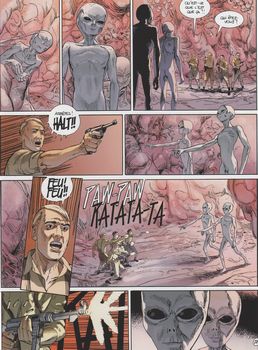 remarques: | 1948, Chicago, l'Eglise des fils d'Ezechiel dirigée par le père Jones est contactée par un soi-disant envoyé de Dieu pour aider Jones dans sa mission d'agrandir son Eglise. >> p. 7 le miracle accordé non seulement pour les guérisons physiques mais en donnant aussi au père Jones le pouvoir de manipuler les medias afin de faire connaître l'Eglise des fils d'Ezechiel en Namibie, le noir "original" (voir le tome 2), celui qui toujours sourit, ranime Kathy avec une substance spéciale, un envoyé du service secret anglais pour contacter Kathy est assassiné et remplacé par un autre inconnu et mystérieux agent = l'imposteur réveillée, Kathy ne se souvient de rien sauf de son escapade dans les souterrains de la mystérieuse base secrète, elle y retourne alors avec son nouveau compagnon-agent mais ne trouvant rien, tous deux rebroussent chemin alors qu'un groupe de nazis qui les avait suivis entrent dans le souterrain après eux mais se font anéantir par des êtres surnaturels entretemps, l'Eglise des fils d'Ezechiel se développe considérablement vite avec le père Jones qui a maintenant le pouvoir de faire des miracles, entre autre de léviter Kathy rentre en Angleterre mais à l'escale du Caire, elle apprend l'assassinat du véritable agent et réussit in extremis à fausser compagnie au faux agent, celui-ci est neutralisé peu après par Mac Donald (voir album no 1) qui semble protéger Kathy Austin plus tard, Kathy est rejointe par le colonel Twain son chef qui va reprendre avec elle l'enquête en Namibie mais au départ de l'aéroport du Caire, tous deux assistent à l'apparition du père Jones qui en lévitation (voir couverture de l'album) s'adresse à ses fidèles qui le prennent pour le Messie >> p. 31 la légende d'Ezechiel sur la fin du monde >> p. 36/37 les cauchemars de Kathy la suite dans l'épisode qui devrait être l'avant-dernier album de la série >> ce troisième épisode est à nouveau décevant, pas de soucoupes volantes cette fois mais des illuminés et on tourne vraiment en rond en ajoutant à la complexité du récit l'apparition d'un élément religieux avec la secte du père Jones qui serait manipulée par des extra-terrestres (Leo fait valoir à nouveau ses tendances anti-religieuses) de plus le graphisme de Marchal change radicalement en médiocrité, ce qui n'améliore pas l'épisode |