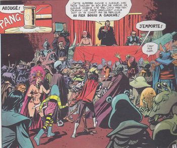 remarques: | tome 8: il est des trésors de légendes qui partout et toujours ont hanté les esprits, l'univers en regorge et pourtant, le plus fabuleux qui, à lui seul, les vaut tous, est aussi le plus petit: il tient dans le creux d'une main, celle de Musky par désespoir, Axle essaie de se suicider suite à l'apparition dans ses rêves de l'intrus qui capture Chimeer et la torture, pour sauver Axle, Matt et Musky lui administrent du sang de Crotiga du Bletz qui a le pouvoir de le rendre combatif, Axle défie alors l'intrus qui invite Axle à une vente aux enchères où le buste de Chimeer (buste qui rend l'impression d'être vivant)sera mis en vente, cette vente se déroule dans le système de la "Tortue", lieu de rendez-vous des pirates de l'espace où le Komprintz (en fait l'intrus) règne en dictateur, le vrai but du Komprintz est toutefois de s'approprier les trois graines d'éternité (incarnus eternae) détenues par Musky, c'est le prix du buste de Chimeer qui mettra fin aux persécutions de l'intrus, mais Axle trouve le prix trop élevé et le conteste sous l'accusation de violation et vol de rêve (le protest'sonn) selon la loi de la flibuste, cette accusation provoque un défi de combat singulier entre Axle et le Komprintz et les 3 graines cautionnées par Musky seront l'enjeu de ce duel n.b. les 3 graines sont pour les Eternautes un gage de résurrection >> p. 21 description du système de la Tortue dans la galaxie des Karahibes >> p. 23 la salle de vente Drouyôh avec l'expert Bourain (Buret?) le combat est gagné par le Komprintz et Musky y perd ses trois graines d'éternité, elle devient mortelle tandis que Axle est malgré tout sauvé, car pour combattre le Komprintz, Matt et Musky ont envoyé une copie-robot de Axle >> un très bon volume, on revient à des récits plus concrets et beaucoup plus passionnants avec toujours d'excellentes illustrations |
