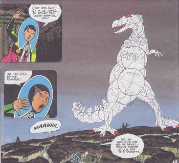 remarques: | tome 9: ceci est l'aventure la plus extraordinaire, la plus inouïe, la plus insensée qui ait jamais été vécue, celle d'un homme qui s'introduit dans le plus insondable des sanctuaires: l'univers mental d'une vraie jeune fille en voulant ravitailler sur Mandala le vaisseau d'argent avec la quetzalitz (plante fournissant d'énormes ressources énergétiques avec son étamine), Axle est pourchassé par la garde pourpre et se réfugie dans le labyrinthe de Mandala qui garde toujours les intrus qui le pénètrent toutefois, après bien des péripéties, Axle et Musky réussiront à échapper au labyrinthe grâce au pouvoir féminin, l'essentiel innommable de toute chose, le labyrinthe virginal étant la matrice d'une femme >> p. 15 le piège des fantaraignes >> p. 21 la machine à pistons qui tuent >> p. 33 la guerre fantasmagorique: chlonk, chlonpf, tchaff, schlaff >> p. 38 le monstre géométrique qui est contrôlé par les équations >> p. 40 la grande catin qui dégoûte Musky parce que ça sent la femme >> si le monstre géométrique est encore plus ou moins logique, le récit de Godard est lui vraiment illogique, mais quand même assez distrayant |