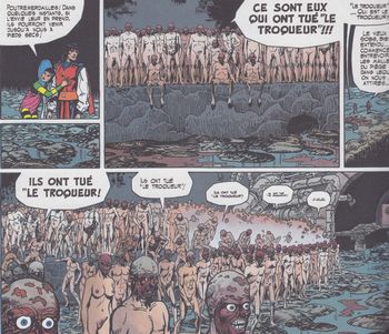 remarques: | tome 11: Khôma, la plus importante et la plus étrange des constellations de la galaxie, muette, murée, interdite, on raconte que tous ses habitants portent un masque "vivant" sur le visage, tous sauf les assassins découverte par des pirates de l'espace d'un objet très convoité par la Guilde: un sarco de kôhmédien (= kôhmédien sans son masque originaire de Kôhmédy), la Guilde s'empare du sarco et après étude entrevoit le moyen d'anéantir le puissant empire du Grand Kôhm et pour ce faire, la Guilde s'adresse à nouveau à Axle Axle désire maintenant un renifleur de couloir supratemporel (= tunnel par lequel on peut rejoindre théoriquement n'importe quel point situé sur la ligne du temps) ainsi que 60 minutes de rêve pour rencontrer Chimeer contre quoi Axle accepte la mission consistant à récupérer un masque de Kôhm pour le greffer sur un agent de la Guilde qui prendra la place du Grand Kôhm, mais il faut pouvoir encore s'infiltrer sur la planète de Kôhmédy >> p. 9 le vrai visage d'un kôhmédien sans son masque >> p. 15 description de Kôhmédy (ou Kôhma), le plus grand fournisseur de quetzal pour la Guilde >> p. 20/21 description d'un masque de kôhmédien Axle contacte alors sur la planète Primus III le braconnier Sobsquerchman (dit Sobs-file-sous terre), susceptible de lui fournir des masques en contrebande et qui connait une entrée pour infiltrer Kôhmédy, Sobs sera éliminé par la milice kôhmédienne, mais réussira à donner à Axle un microsarbak (qui paralyse le porteur d'un masque) et à lui indiquer l'entrée du souterrain pour arriver à Kôhmédy, mais le Fouineur fait courir le bruit que Axle a tué Sobs et, lors de leur trajet souterrain, Axle avec Musky sont harcelés par la plèbe de Kôhmédy à qui ils échapperont in extremis >> p. 29 l'entrée du souterrain: une hernie spatiale >> p. 42 le comité d'accueil dans le souterrain n.b. seuls les assassins (rebelles au Grand Kôhm) n'ont pas de masque sur Kôhmédy >> un album à suspense multiple mais de bonne fracture avec une petite allusion au film "alien" |