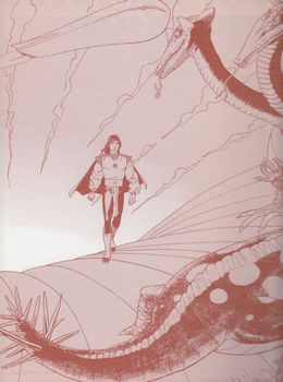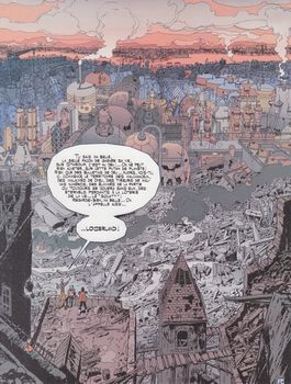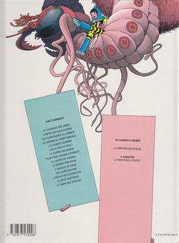 remarques: | tome 16: partout où des créatures s'installent et prolifèrent, il s'en trouve parmi elles pour inventer des sociétés insensées et partout la folie règne, repue, satisfaite, mais sur Stardup, c'est la loi la plus folle qui triomphe, c'est la loi du jeu l'odyssée d'Axle le mène à Stardup, la planète du jeu, le dépotoir des étoiles où tout se joue ou se gagne ou se perd et qui est gouvernée par le président-croupier, Jeddha Orianelli, le maffiosi, rival du président-croupier qui contacte Axle en lui proposant son alliance contre le président-croupier, à cet effet, il faut retrouver et prendre possession de la martingale céleste (instrument qui permet de toujours gagner en percevant la quatrième dimension: celle du temps et cette martingale aurait été inventée par Korian, père d'Axle qui serait encore sur Stardup), cette martingale devrait se trouver dans le vaisseau d'argent d'où aussi la raison de l'accusation contre Axle et Musky par les chefs de Stardup entretemps, Axle et Musky doivent s'enfuir, car ils sont recherchés par la police des jeux de Stardup, mais Axle va maintenant tout mettre en oeuvre pour retrouver son père mystérieusement disparu >> p. 10 à leur arrivée sur Stardup, Axle et Musky sont soupçonnés être des tricheurs professionnels >> p. 11 le jeu du Telematon (genre super lotto) >> p. 25 la traversée du squatt = loserland = territoire des malchanceux >> p. 28 la G'Zeiss Orgasmine = fille légère dotée d'une forte poitrine (chez les Eternautes, cette particularité de poitrine est considérée comme plutôt rare si on la compare à Musky et Muskie) >> assez bon album quoique légèrement en baisse et il semble que Godard affectionne particulièrement le jeu, le show-business, les attractions, etc n.b. nouvel éditeur "le vaisseau d'argent" créé par Ribera+Godard, nouvelle qualité d'impression, papier glacé, nouvelle page de garde et premier titre sur la liste rose du 4ème plat: le dépotoir des étoiles |