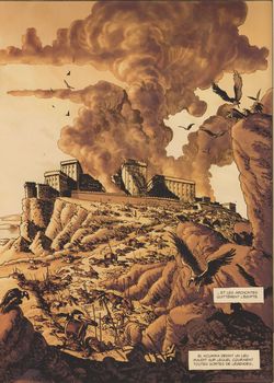 remarques: | le château des Djinns (Antioche, Jérusalem, Petra, les croisades, les Templiers vers 1176) thème principal: les Templiers et la légende du Graal les archontes quittent l'Egypte mais Reka se battra encore contre les pharaons, Dyo utilise les philistins contre les hébreux pour essayer de récupérer son ivoire et Axer devient une déesse chez les grecs, seul Erlin ne fait plus parler de lui 1176 sur la route d'Antioche, le chevalier Renaud de Châtillon fait une curieuse rencontre avant d'être attaqué par des goules (espèce de morts-vivants) à Jérusalem, Reka est devenu le chef des Templiers et s'intéresse à Renaud de Châtillon, celui-ci arrive à Jérusalem chez son beau-fils Bohémond, Renaud échappe aux sbires de Dyo et rencontre Aker, venue à Jérusalem pour rechercher l'ivoire de Dyo >> p. 22 l'histoire de la conquête d'Antioche par les croisés de Godefroy de Bouillon grâce, semble-t-il, à l'ivoire de Dyo considéré par une prêtre comme une relique de la croix du Christ Renaud est sorti des griffes de Dyo par le templier frère Thomas qui le conduit à Jérusalem alors que Aker se rend à St-Jean-d'Acre où elle rencontre l'écrivain Chrétien de Troyes en quête du Graal entretemps, Renaud de Châtillon se rend avec les templiers à Petra où se trouve le château des Djinns et où il retrouve Aker avec Chrétien de Troyes, ils sont attaqués par les arabes Bani-Sar, mais sauvés inopinément par les soudards de Dyo qui arrivent toutefois trop tard pour reprendre la coupe d'ivoire de Dyo transmise par des prêtes arméniens à Aker Renaud de Châtillon retourne dans son fief d'Outre-Jourdain et Aker repart en Grèce pour mettre la coupe d'ivoire en lieu sûr >> un récit vraiment mystique, un peu compliqué et plutôt désordonné, mais qui sera typique pour les prochains volumes de la série, toutefois le graphisme est respectable et le texte est assez intéressant |