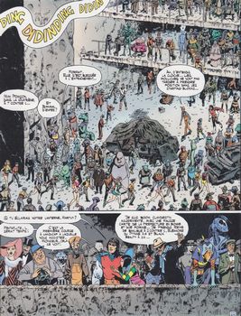 remarques: | tome 17: aussi loin que l'on aille dans l'espace, il est des rêves humains qui partout hantent les esprits et les coeurs, le plus ancien et le plus fou de tous: prévoir l'avenir et être toujours gagnant au grand jeu de la vie le seul thème de cet album consiste en une fuite de Axle, Musky et de leur ami Marthy Lamarture à travers Stardup pour échapper à la police des jeux, finalement, Axle fera chanter le président-croupier de Stardup qui le laissera quitter Stardup avec le vaisseau d'argent >> p. 12 Germaine, la ménagère-robot peu intellectuelle sur le vaisseau d'argent >> p. 21 vers l'ancienne ville nouvelle de Vraye à travers les cimes des arbres (le chemin des cimes) pour échapper aux rampants = patrouilles forestières de Stardup >> p. 25 le tiercé des jeunes vierges (= des pouliches) >> p. 30 les squinnes = voyous des parkings abandonnés >> p. 35 Stardup, la planète du jeu, une ludocratie = système social très élaboré dans lequel tous les actes de la vie courante de la naissance à la mort sont régis par les lois de la chance et du jeu, gouvernée par le ludocrate président-croupier Ze-Winner >> p. 36 la partie d'échec-coinché entre Ze-Winner et Orianeli, son challenger, organisée par le grand présentateur Ze-Trône >> p. 46/47 la populace qui est heureuse de se battre dans de violentes manifestations lors de tournois sportifs, le tout planifié à l'avance et lors du départ du vaisseau d'argent, Matt croit avoir trouver l'endroit où Korian, père d'Axle, pourrait se trouver, la quête continue >> un album qui ne laisse plus qu'un médiocre arrière-goût des aventures précédentes d'Axle, le tout se référant à une société décadente qui rappelle beaucoup l'actuelle société de chez nous |