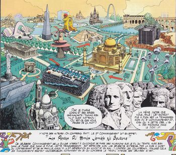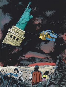 remarques: | tome 18: les routes de l'espace sont parsemées de rêves insensés tous plus fous les uns que les autres et là-bas, aux limites de l'empire, là où personne ne se risque, il est une planète qui abrite le rêve le plus fou d'entre les fous, et ce rêve résonne comme un cri: je t'aime à bord du vaisseau d'argent, Matt croit avoir localiser Korian, père d'Axle à Elphantisias de la Cshnouffle >> p. 7 durant le voyage, des échappements holographiques-parasites monstrueuses se manifestent c'est la manière au vaisseau d'argent de faire savoir à Axle que le vaisseau d'argent ne se porte plus très bien pour remettre en ordre le vaisseau d'argent, Axle doit faire une halte-repos sur N4W3T7 = une petite planète touristique notée dans le Gomyo (= guide touristique interstellaire), en fait de tourisme, on arrive dans une cité genre Far West peuplée de desperados qui s'expriment dans un langage particulier, dérivé de l'espagnol de Ribera >> p. 14 le desperado qui continue de pisser bien qu'il soit à moitié mort >> p. 27 le cri d'un desperado: "las insfantile des poutas" sur le point de quitter N4W3T7, d'étranges apparitions se manifestent dans le ciel cosmique >> p. 22 apparition de la statue de la liberté poursuivant un mystérieux cargo, le vaisseau d'argent pénètre dans un parc d'attractions du cosmos qui contient les monuments les plus célèbres de l'histoire (dont la Tour Eiffel) >> p. 31 le nom du parc: Munshineworld conçu par la fondation Korian Munshine, mais ce parc semble être en contradiction avec le 5ème commandement: "les portes du temps jamais ne boutera" donc pas d'intrusion dans le passé ni dans le futur et pas de commerce avec des oeuvres d'art ou monuments célèbres >> p. 34 le compte bancaire numéroté en Schouisse mais comme l'explique le gérant du parc, la fondation ne transgresse pas le 5ème commandement, car les monuments ne sont prélevés que quelques minutes avant qu'ils ne disparaissent dans une conflagration neutronique ou nucléaire finalement, Axle quitte le parc en n'ayant rien trouvé de concret sur son père, la quête continue donc >> on récapitule aussi dans cet album les aventures passées de Axle tout en racontant un peu n'importe quoi mais l'idée de base est originale et reste intéressante avec un bon graphisme |
