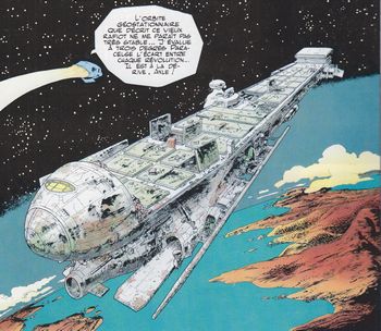 remarques: | tome 21: partout dans l'univers, l'air et l'eau gangrenés, viennent à manquer aux hommes affolés, partout, des civilisations agonisent sous des montagnes d'immondices, leurs propres déjections, seule, une planète se complait dans la fange: Merdblah-la-Noire durant sa quête, Axle est confronté avec un problème de contamination spatiale où toute la science sophistiquée du vaisseau d'argent ne peut lutter contre ce virus inconnu, genre de lichen qui digère toute chose et Musky est contaminée à son tour >> p. 4/5 l'arrivée de la barge de Archibalt Lachtouye, agent de prospection qui contamine le vaisseau d'argent et qui sera soigné sans succès par le supertoub du vaisseau selon l'ordinateur du bord, Axle doit se rendre sur la planète Merdblah-la-Noire = le dépotoir universel où tous les déchets de l'univers sont déversés (un dépotoir des étoiles mais autrement que dans le volume 16) et où seule la populace qui y vit peut fournir un anticorps au virus >> p. 21 le supertanker provenant de Merdblah-la-Noire qui est à la dérive et sur lequel un rescapé est récupéré qui donne à Axle l'itinéraire le plus rapide pour rejoindre Merdblah-la-Noire >> p. 32 la tentative de suicide avortée par Musky >> p. 35 le déchargement de détritus sur Merdblah-la-Noire par un transporteur et l'arrivée du vaisseau d'argent depuis lequel Musky sent déjà l'odeur qui règne sur Merdblah-la-Noire >> p. 47 Axle réussit à capturer un habitant de Merdblah-la-Noire (une femelle porcine) qui lui fournit un anticorps, mais qui tombe amoureuse de Axle et qui se lamente affreusement lors du départ de celui-ci >> pour la première fois dans ce récit, Axle aime vraiment son petit clown Musky, un bon graphisme mais si ce n'est pas un album de merde, c'est du moins un album sur la merde et malgré la publicité donnée aux cochons immondes de Merdblah, le texte n'est pas merdeux, mais pas non plus très recherché n.b. dernier album produit par les éditions Vaisseau d'Argent, la suite sera reprise par les éditions Dargaud mais les auteurs ne donnent aucune explication à ce sujet (contrairement à la préface donnée au début de l'album 16 concernant l'introduction des éditions Vaisseau d'Argent) |