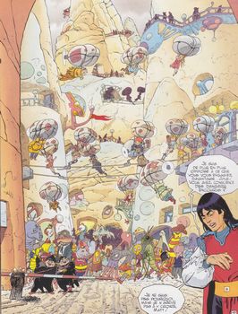 remarques: | tome 23: l'univers est immense, l'imagination de la nature (et de l'auteur) est sans limite et partout des surprises attendent le voyageur imprudent qui veut fuir les épreuves et toujours les trouve devant >> p. 3 le vieux livre chinois de philosopie parmi l'informatique (voir le prologue) dans ses recherches sur les rêves, Axle découvre des pilules psycho-matérialisateurs phantasmatiques, inventées par Korian son père, qui matérialisent les rêves >> p. 6 les rêves d'Axle qui se matérialisent lors d'une séance de translator et Musky, qui a aussi utilisé ces pilules, se fait enlever par ses rêves matérialisés, Axle réussit à la poursuivre sur une planète qui n'existe pas et où Axle n'existe pas non plus >> p. 17 mr. Einstein, l'ordinateur de coordination centrale de grande puissance sur le vaisseau d'argent >> p. 19 les habitants de la planète qui n'existe pas (des fantômes?) sur cette planète, Axle rencontre son sosie: Karxelos, le rebelle-terroriste qui combat le Buste, chef de la planète = robot métallique avec un buste humain qui a capturé Musky et qui veut aussi en faire un buste en l'amputant de la tête et des membres >> p. 28/29 le culte du buste à Bustopolis, un buste parfait car il est mécanique Karxelos ne joue toutefois qu'un petit rôle dans ce récit, disparaissant assez vite et ce sera Axle qui délivrera Musky de la salle d'opération, mais Musky ne reconnaîtra plus Axle et disparait dans un autre monde alors que Axle est récupéré par le vaisseau d'argent >> p. 35 le saut étrange d'Axle pour sauver Musky n.b. à partir de cet album Musky disparait pour toujours, où a-t-elle bien pu passer?) >> mais tout cet album ne pourrait être qu'un mauvais rêve dont le graphisme reste toutefois de bonne fracture alors que le scénario dérive grandement malgré une idée assez originale, à noter une couverture d'album bien effectuée |
