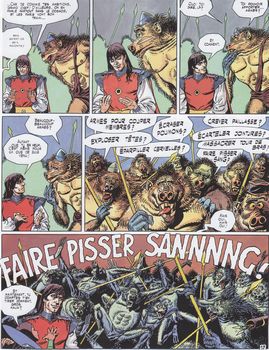 remarques: | tome 28: passant, si ta route te conduit à proximité de Therato VII, un conseil, poursuit ton chemin du plus vite que tu peux et sans te retarder, car partout dans le cosmos, on appelle cette planète, l'enfer des vivants dans les territoires de la Guilde, la rumeur se répand que Axle est vraiment mort, mais aussi que Aimos a trouvé le moyen de le faire revenir à la vie (= résumé des deux albums précédents) entretemps, les forces de la Guilde ont réussi à prendre possession du dauphin d'argent, car suite à la disparition d'Axle le système de défense ne fonctionnait plus normalement, Aimos semble être mort et Matt Gammone est prisonnier, c'est à ce moment que Axle et Muskie reviennent sur le dauphin d'argent depuis le monde de l'anti-temps, Reemihc en est aussitôt informée et se rend sur le dauphin d'argent auquel Axle commence à donner de nouvelles instructions, Reemihc donne l'ordre à ses troupes d'éliminer Axle et Muskie en les envoyant dans un trou noir, mais de ce fait, elle transgresse le 21ème commandement de la Guilde >> p. 17 le 21ème commandement: "à autrui la vie jamais ne soustraira sans en conserver duplicata" Axle encore sous le choc de l'anti-temps s'évanouit et avec Muskie, ils sont embarqués sur une barge en direction de Therato VII, la plus terrifiante planète d'un trou noir peuplée d'animonstres, toutefois avant de s'évanouir, Axle a réussi à reprendre le contrôle du dauphin d'argent et celui-ci refuse de laisser sortir Reemihc arrivé sur Therato VII, Axle explique à Muskie les particularités de la planète >> p. 23 Therato VII est peuplée de prototypes extra-terrestres super agressifs, destinés aux armées de l'Empire mais rejetés sur Therato VII, car devenus incontrôlables pendant ce temps, sur le dauphin d'argent, les soldats de la Guilde s'entretuent pour la possession des rhumeraudes alors que Axle et Muskie sont faits prisonniers par des animonstres, Matt recommande à Reemihc de retrouver Axle pour pouvoir quitter le dauphin d'argent, Reemihc accepte et Matt la met en sécurité dans un caisson bien protégé, tandis qu'il envoie un capteur vers Therato VII pour localiser Axle sur Therato VII les animonstres s'entretuent aussi pour la capture de Axle et Muskie et >> p. 42 ce sont les babouinches des Galopopozes (les plus dangereux de tous mais qui peuvent parler) qui prennent le dessus, Axle négocie avec eux en leur proposant de leur livrer des armes >> p. 45 pour faire pisser le sang entretemps, le capteur rejoint Axle, via le capteur Axle donne l'ordre au dauphin d'argent de faire venir une barge de récupération et en même temps d'amener sur Therato VII le caisson avec Reemihc à l'intérieur, Axle et Muskie retournent au dauphin d'argent en laissant Reemihc aux bons soins des babouinches >>> quelle belle fin vengeresse, le graphisme est toujours bon mais le scénario piétine quelque peu avec un texte surtout constitué d'onomatopées tels que ayalavan, poutaflok, ffflang, gragnyaaaap, hercx, brouuniii, gradarflfl, ahok, eigh, dzzinng, vraom, etc un récit débordant surtout d'ani-mosité |