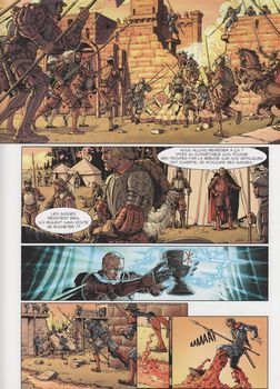 remarques: | 1527, Rome, Florence, lutte entre gibelins et guelfes, thème principal: guerres de religion en Italie 1266, Charles d'Anjou appelé par le pape remporte la victoire à Ponte Calore sur Manfred, bâtard de Frederic II de Hohenstaufen, Naples et la Sicile appartiennent maintenant à Charles d'Anjou, puis en 1268 c'est l'assaut sur la forteresse de Lucera où Conradin, le fils cadet de Frédéric II, âgé de 16 ans, est mis à mort tout comme les petits-enfants du dragon (= Frédéric II) qui sont éliminés ainsi la race des Hohenstaufen fut éteinte; Reka par l'entremise de Charles d'Anjou venait de vaincre les protégés d'Aker, la coupe (Dyo) et la lance (Reka) avaient triomphé des Hohenstaufen, mais la peste menaçait maintenant les partisans de Reka, ce fléau était envoyé par Guillaume de Lecce pour se venger Florence 1527, Aker réunit ses fidèles et dépêche à Rome son mage Michel de Nostredame dit Nostradamus, protégé par les chevaliers noirs furtifs (genre de condottiere), Nostredame est chargé d'enquêter sur la production de cartes magiques, fabriquées par l'orfèvre Benvenuto Cellini pour le compte des moines rouges au service d'un nouvel archonte: Guillaume de Lecce ces cartes appelées Eikôns permettent la reproduction du pouvoir des ivoires totuefois Reka et Dyo sont aussi à la recherche de l'origine de ces cartes, entretemps Cellini s'apprête à voler les trésors du pape enfouis dans une cave secrète mais un mystérieux monstre-gardien attend les voleurs et les élimine alors que Dyo conduit les troupes de Charles Quint sur Rome après avoir vaincu François Ier à Pavie et que Reka prépare la défense de Rome >> p. 6 + 18 la peste qui frappe >> p. 25 Cellini qui tue le connétable de Bourbon avec sa super-carabine >> p. 26 les mercenaires suisses qui laissent leurs femmes dans leurs montagnes c'est alors une suite de développements où chaque parti joue avec ses propres cartes magiques (feu, peste, flamme liquide, explosifs, etc), finalement c'est le chaos et l'anarchie qui s'installent avec l'apparition d'un 5ème archonte: Guillaume de Lecce avec ses moines rouges qui cherche à posséder le même pouvoir que les ivoires originales c'est aussi le temps des réformes de Luther contre le pape à Rome, le roi de France contre l'empereur Charles-Quint, guerres de religion en Allemagne où les portes de l'enfer sont en train de s'ouvrir, un double négatif et maléfique commence à se manifester, le jeu ne se jouant plus seulement à quatre Dyo, Erlin et Aker veulent faire une trêve alors que Reka se retire quelque peu du jeu >> p. 42/43 les "flagellants" des moines rouges >> une histoire secrète un peu anarchique et rempli de développements magiques, toutefois le graphisme est toujours respectable et le récit plutôt intéressant, probablement un des meilleurs albums de la série |